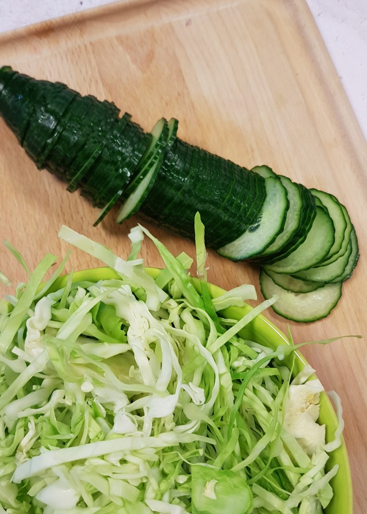 - Préparer la salade : effeuiller légèrement le chou pomme et le rincer, le trancher en deux et l’émincer finement.
