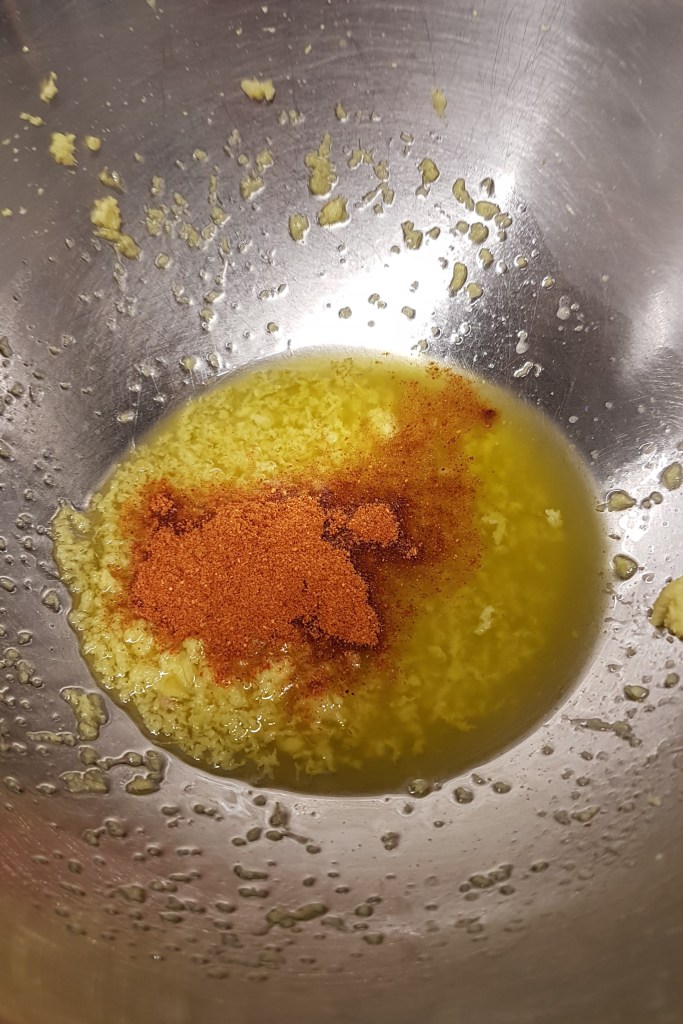 4. Éplucher la patate douce et la couper en dés d’1 cm de côté, puis enrober ces derniers d’huile d’olive et d’épices tandoori.