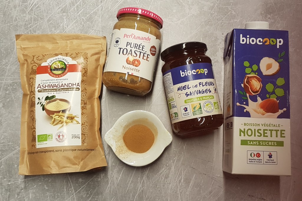 Ici, j’ai incorporé la poudre d’ashwagandha à du lait végétal, de la purée de noisettes toastées et du miel de fleurs sauvages !