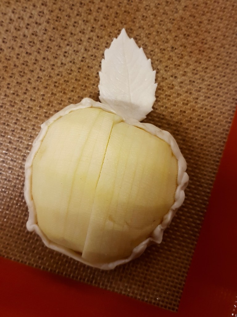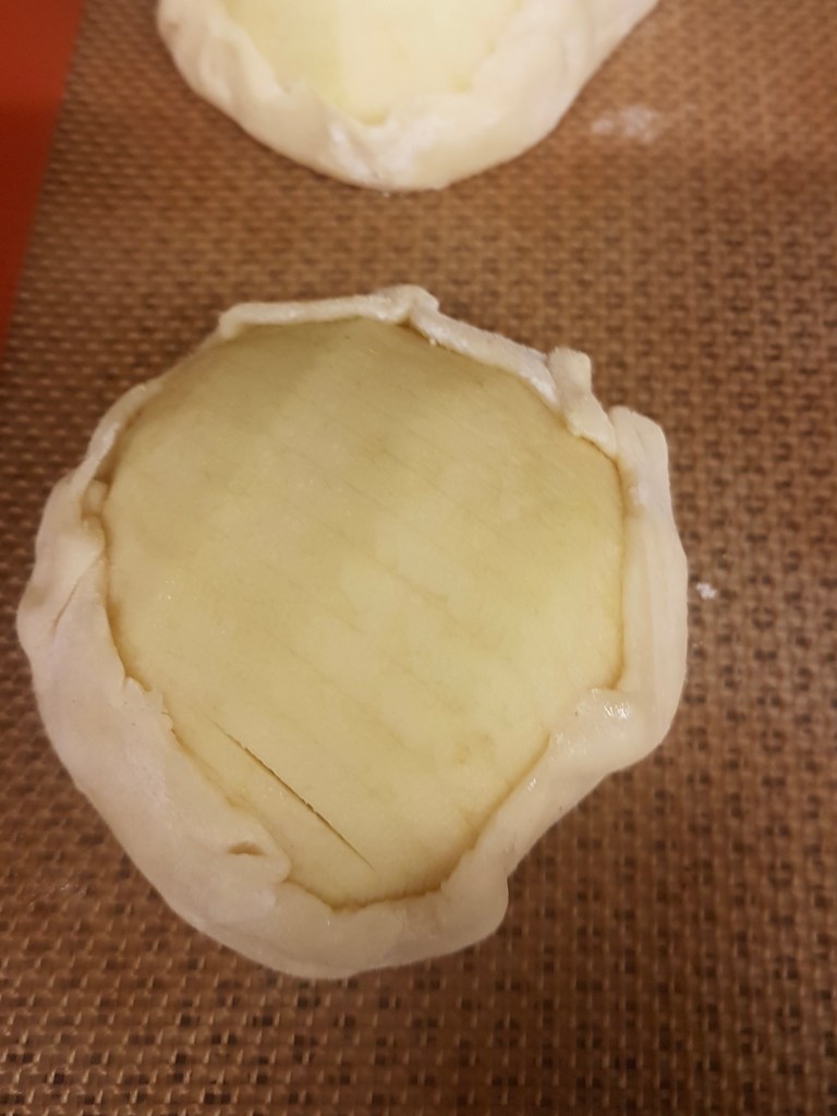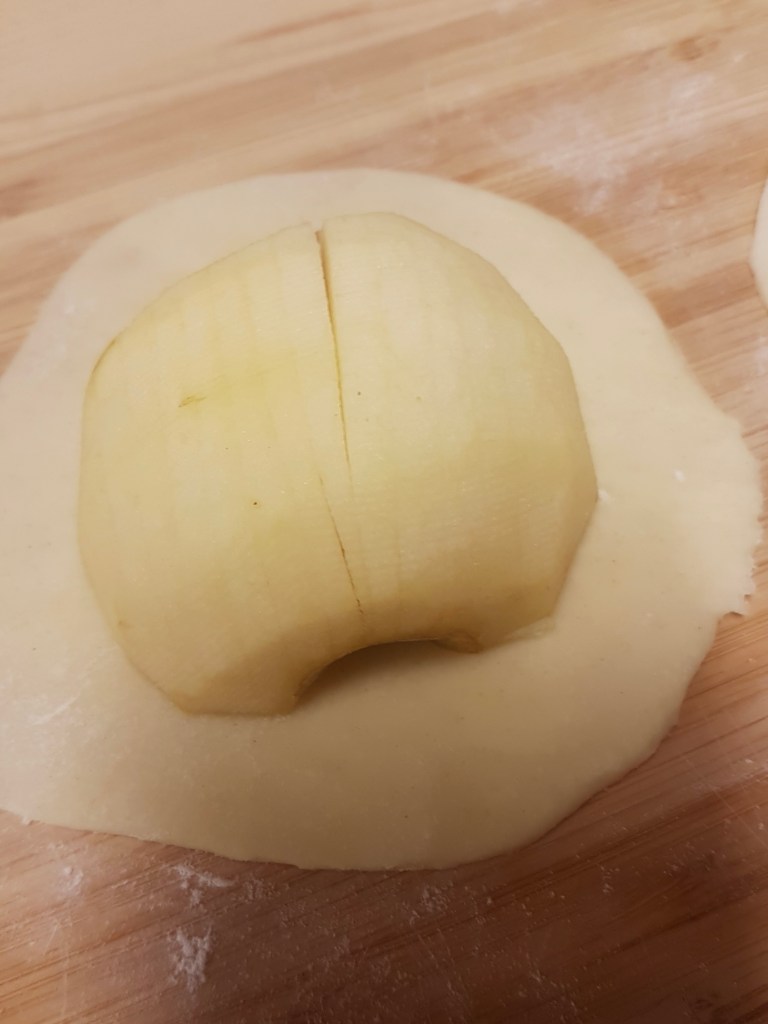 - Placer les demi-pommes au centre de chaque cercle de pâte, puis remonter et pincer la pâte autour des fruits.