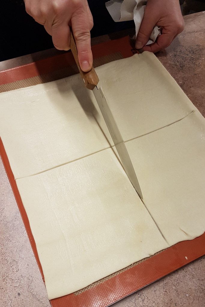 - Dérouler la pâte feuilletée et la couper en quatre carrés.