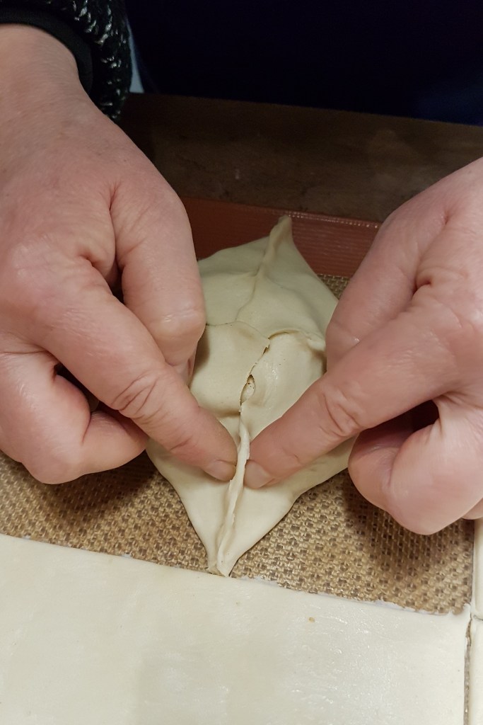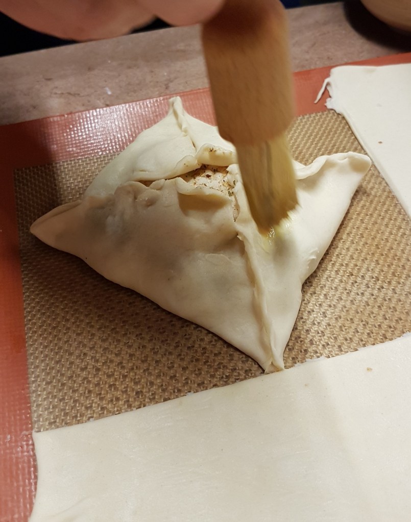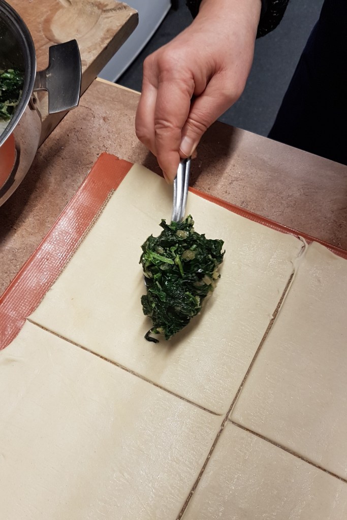 - Recouvrir chaque carré d’épinards, déposer un palet de chèvre au milieu et rabattre les coins de la pâte vers le centre.