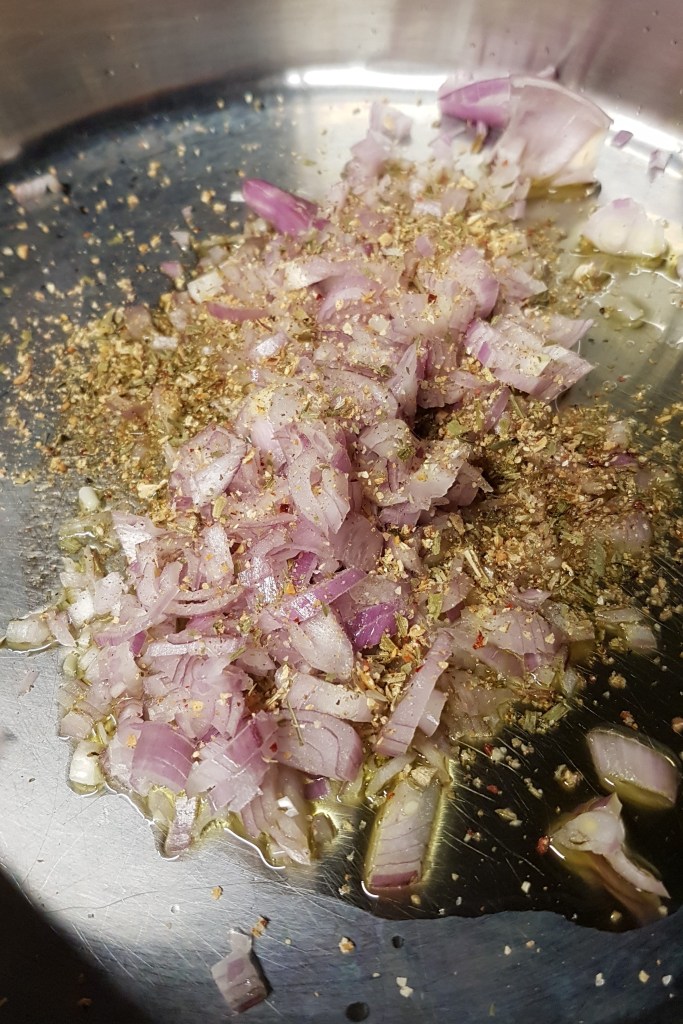- Émincer les échalotes et les faire suer dans une sauteuse avec un filet d’huile d’olive et une cuillère à soupe d’épices.