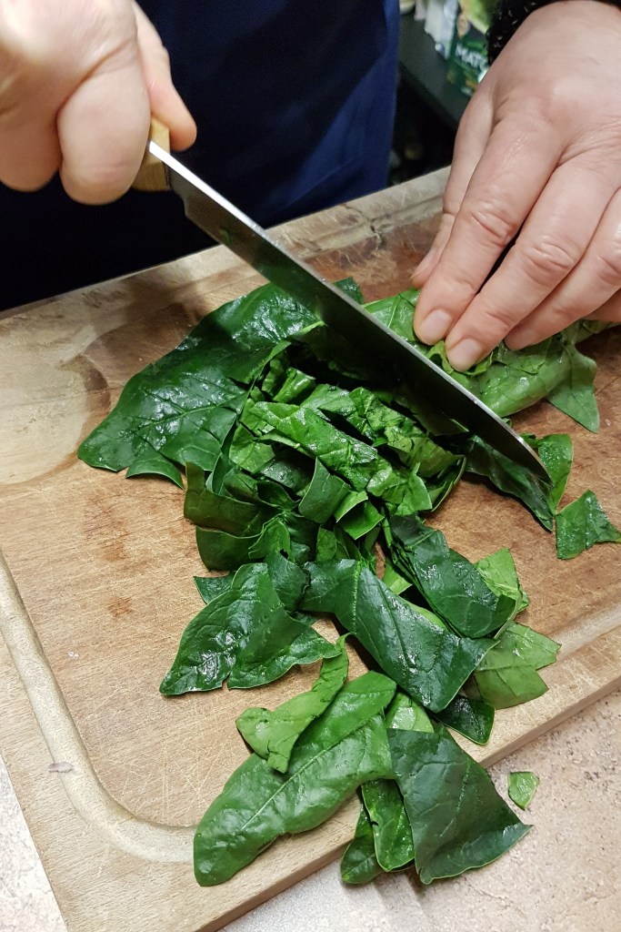 - Laver les épinards, les essorer et les hacher grossièrement. Réserver.