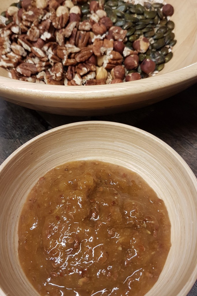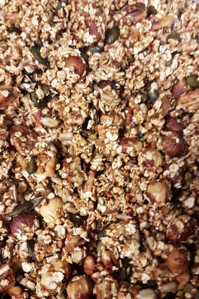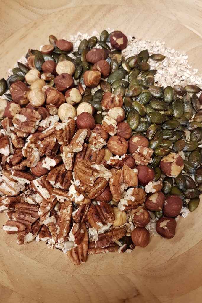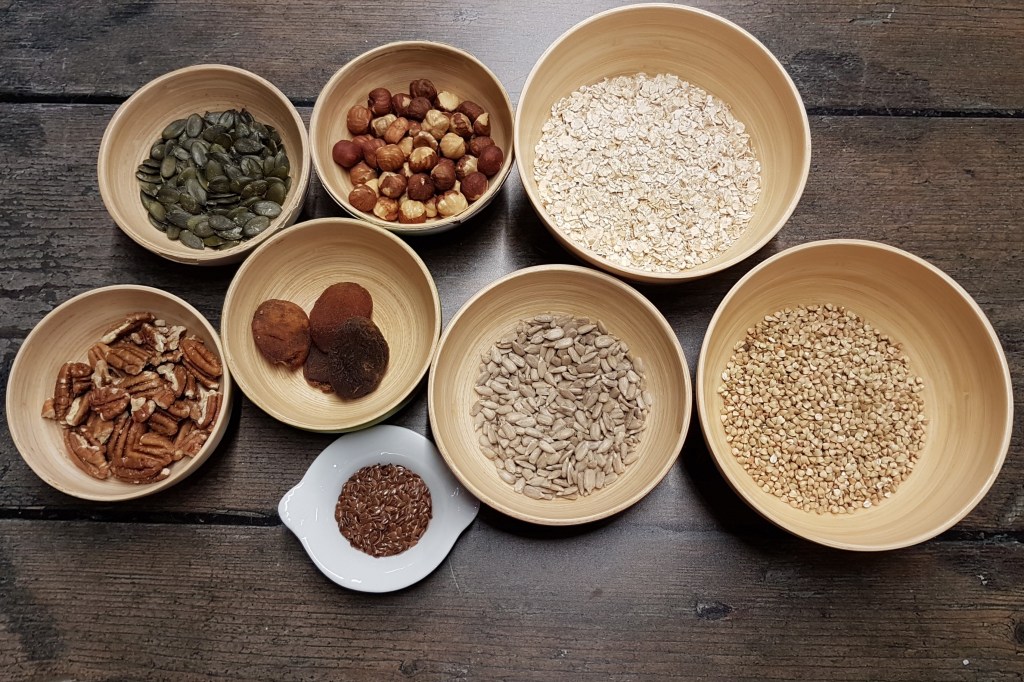 Nous utilisons des petits flocons d’avoine, des graines de sarrasin et des graines oléagineuses : noisettes, graines de courge et tournesol, noix de pécan, lin…