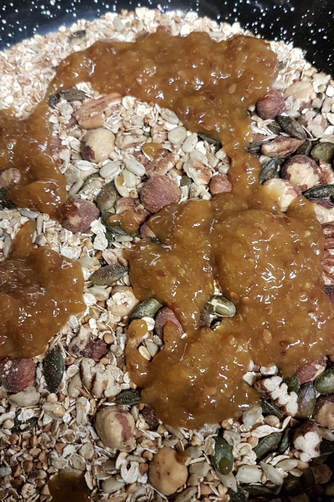 Ce granola est un mélange de céréales, de noix et de graines toastées à sec dans une sauteuse ou un wok ; ce mélange est ensuite aggloméré avec une purée d’abricots secs réhydratés.