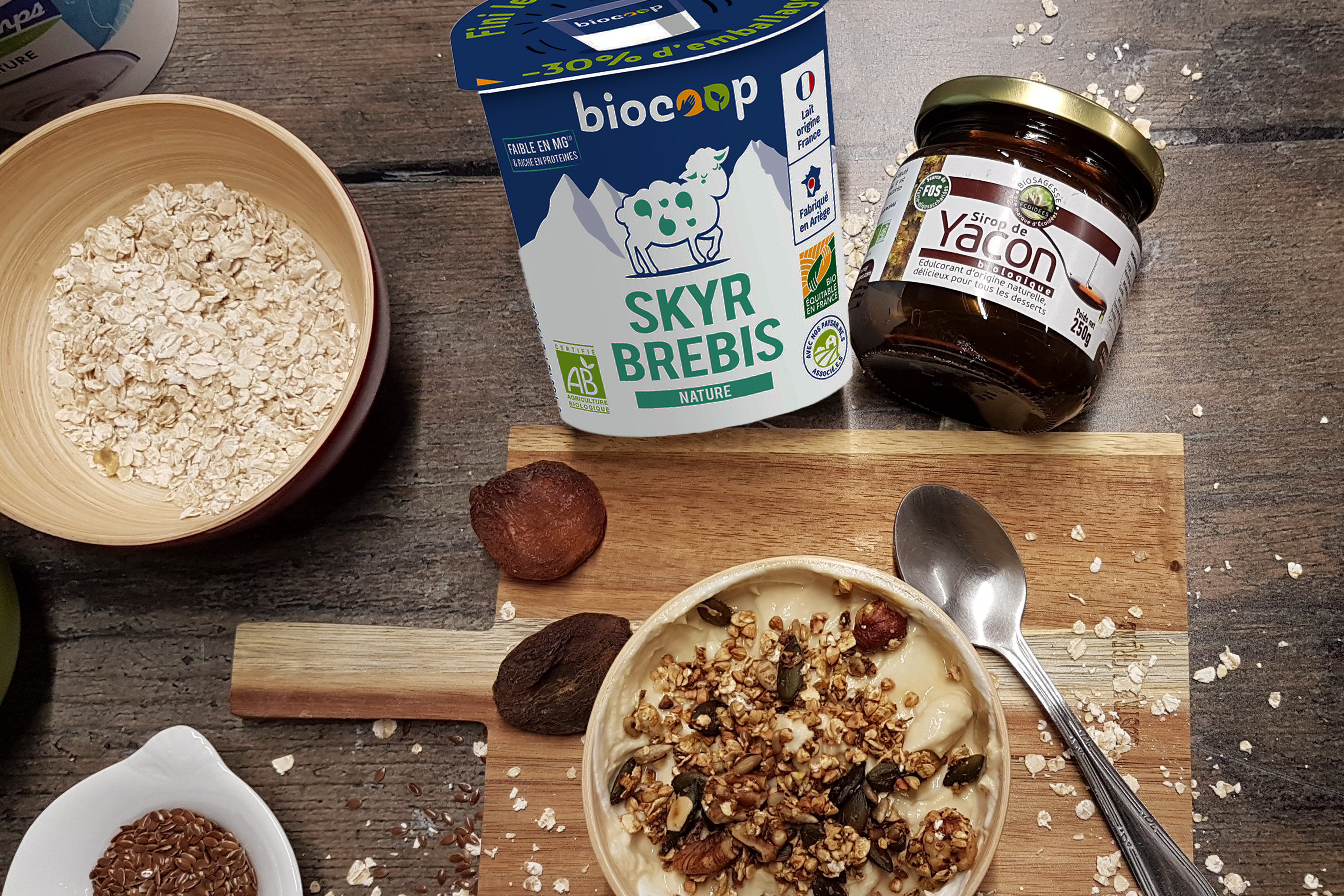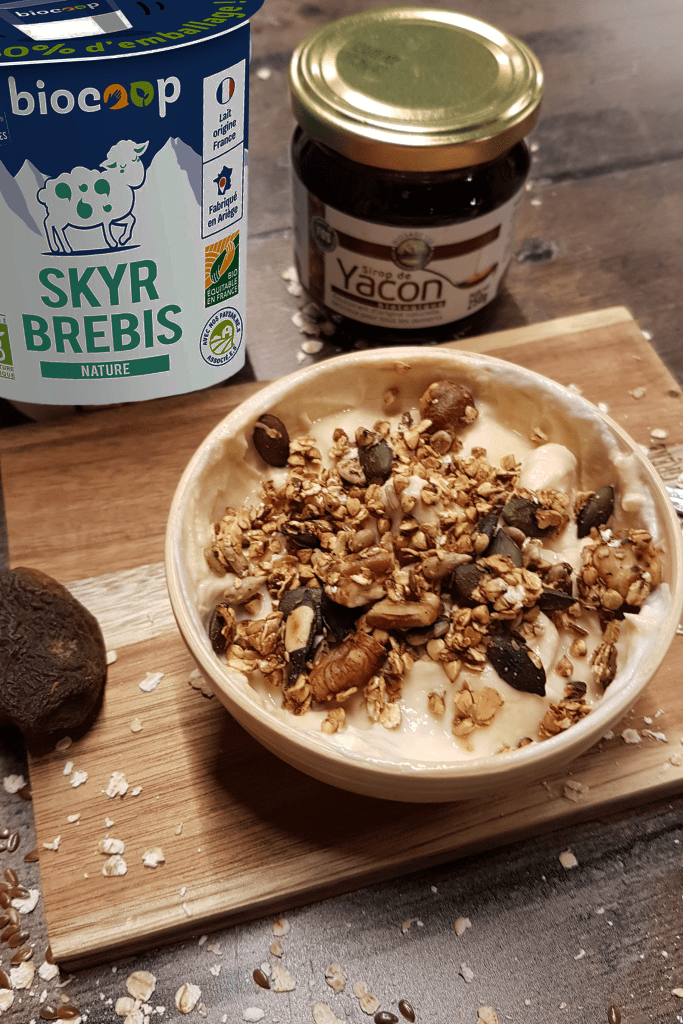 Vous pouvez le déguster tel quel si vous avez une petite faim dans la journée, avec du lait ou une boisson végétale, dans un yaourt ou une compote… Aujourd’hui, nous vous proposons de l’accompagner d’un skyr de brebis et d’un filet de sirop de yacon.