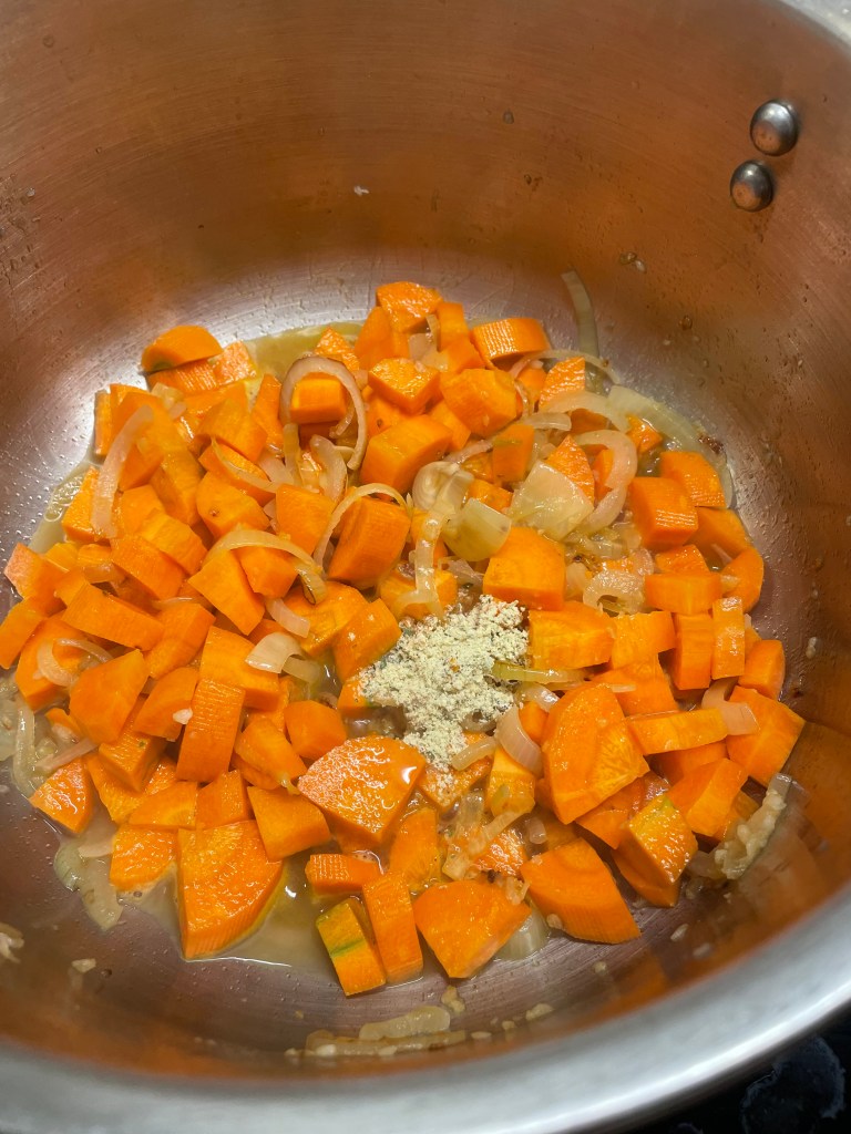Pour apporter un goût équilibré et légèrement corsé à ce potage, en plus du sel et du poivre, nous avons utilisé une cuillère à café de bouillon de légumes en poudre Rapunzel sans levure ni sucre ajouté, indispensable de notre placard à cuisine !