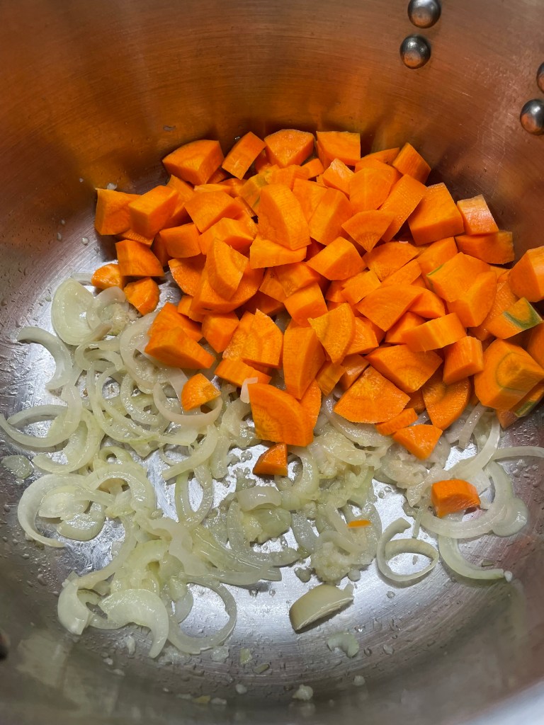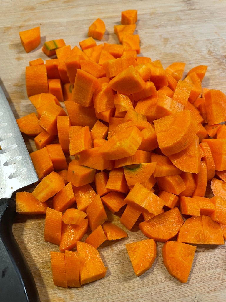 - Laver et éplucher les carottes et les pommes de terre, les tailler en dés et les faire revenir à leur tour 5 minutes.