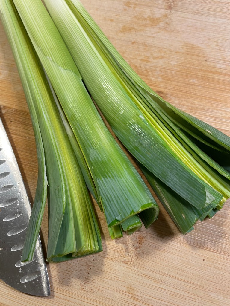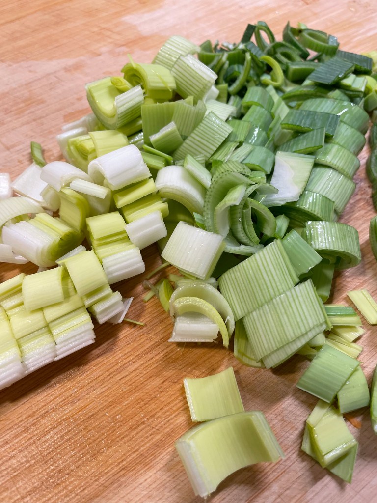 - Entailler les poireaux sur la longueur, les laver et les émincer grossièrement, puis les incorporer aux autres légumes.