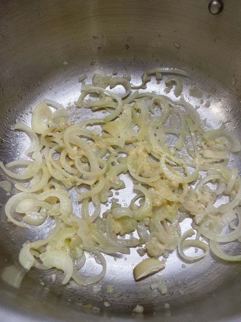- Éplucher les oignons et les émincer, presser l’ail et faire suer le tout 5 minutes dans l’huile d’olive dans un faitout.