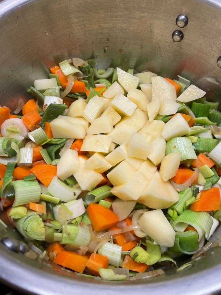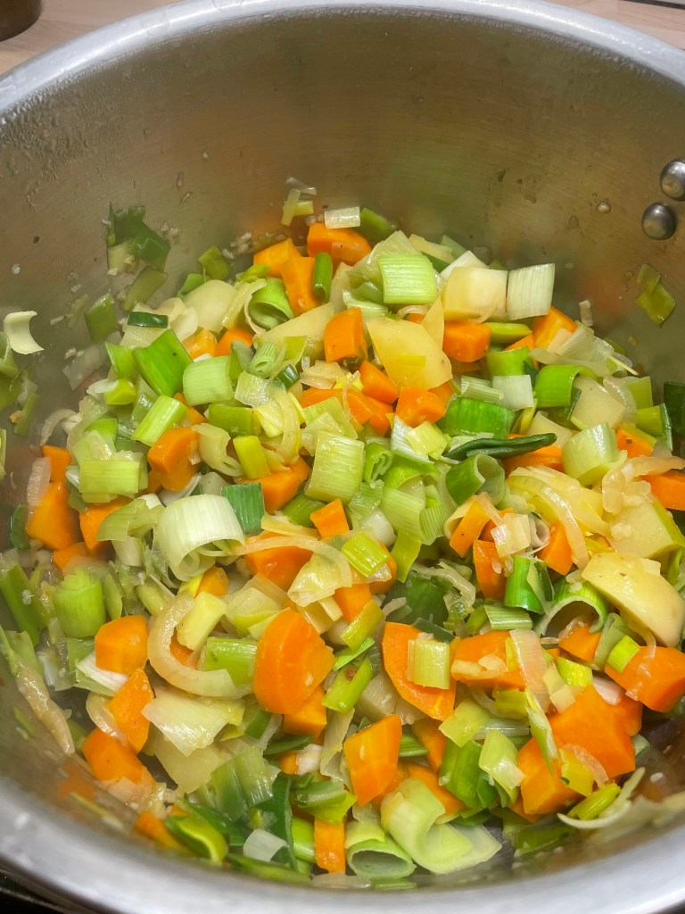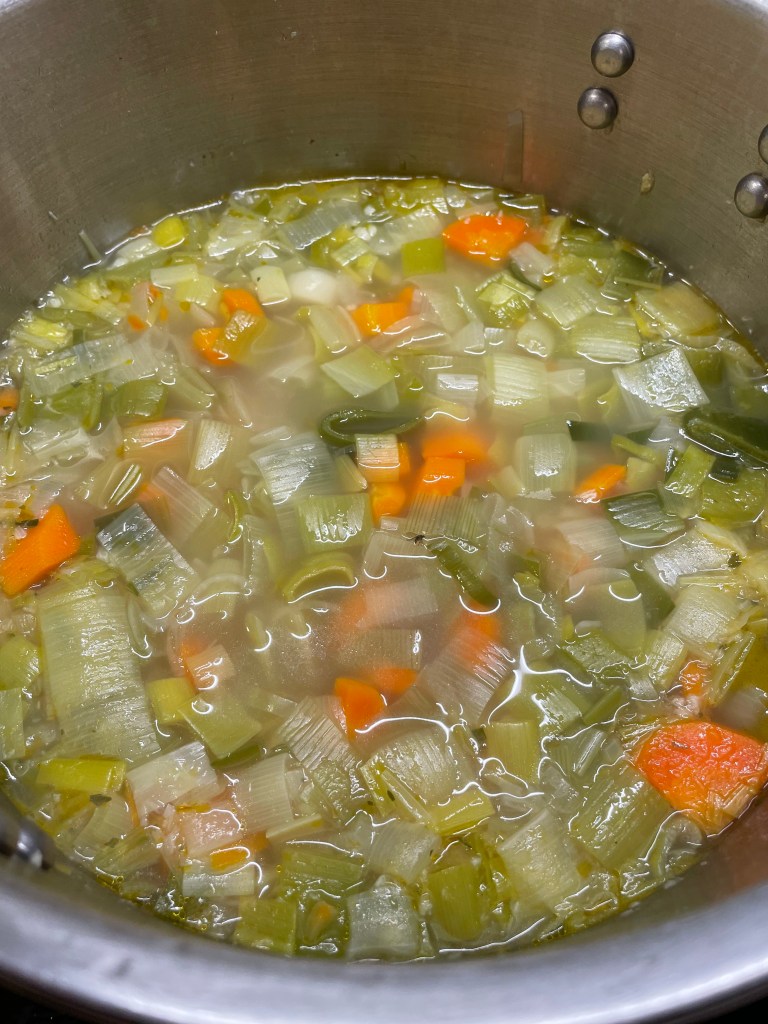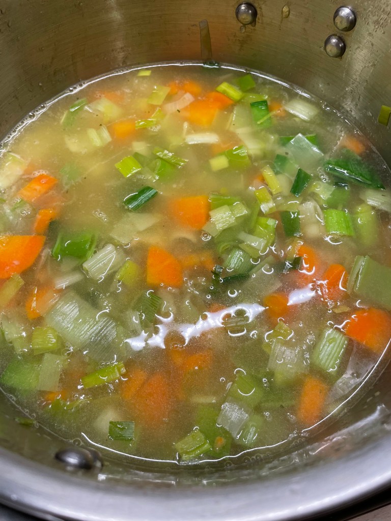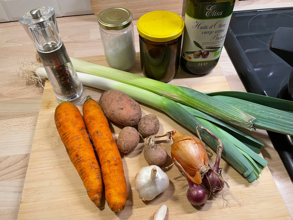 Principalement composé de poireaux et de carottes, il est simplement accompagné de deux pommes de terre, d’ail et d’oignon, et assaisonné de bouillon de légumes, de sel et de poivre !