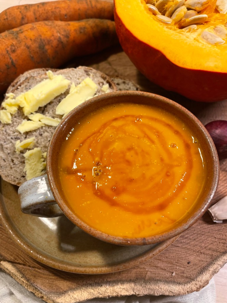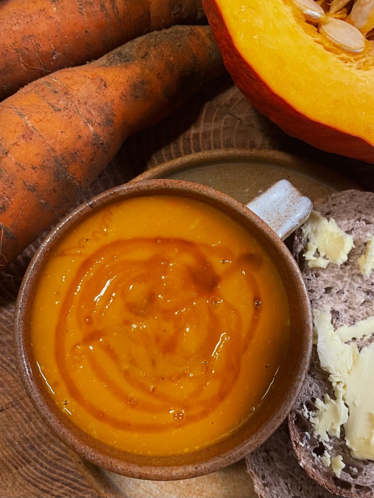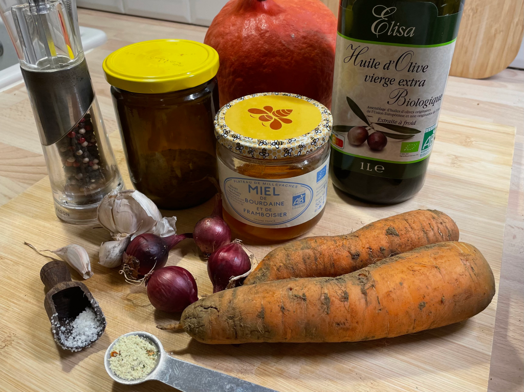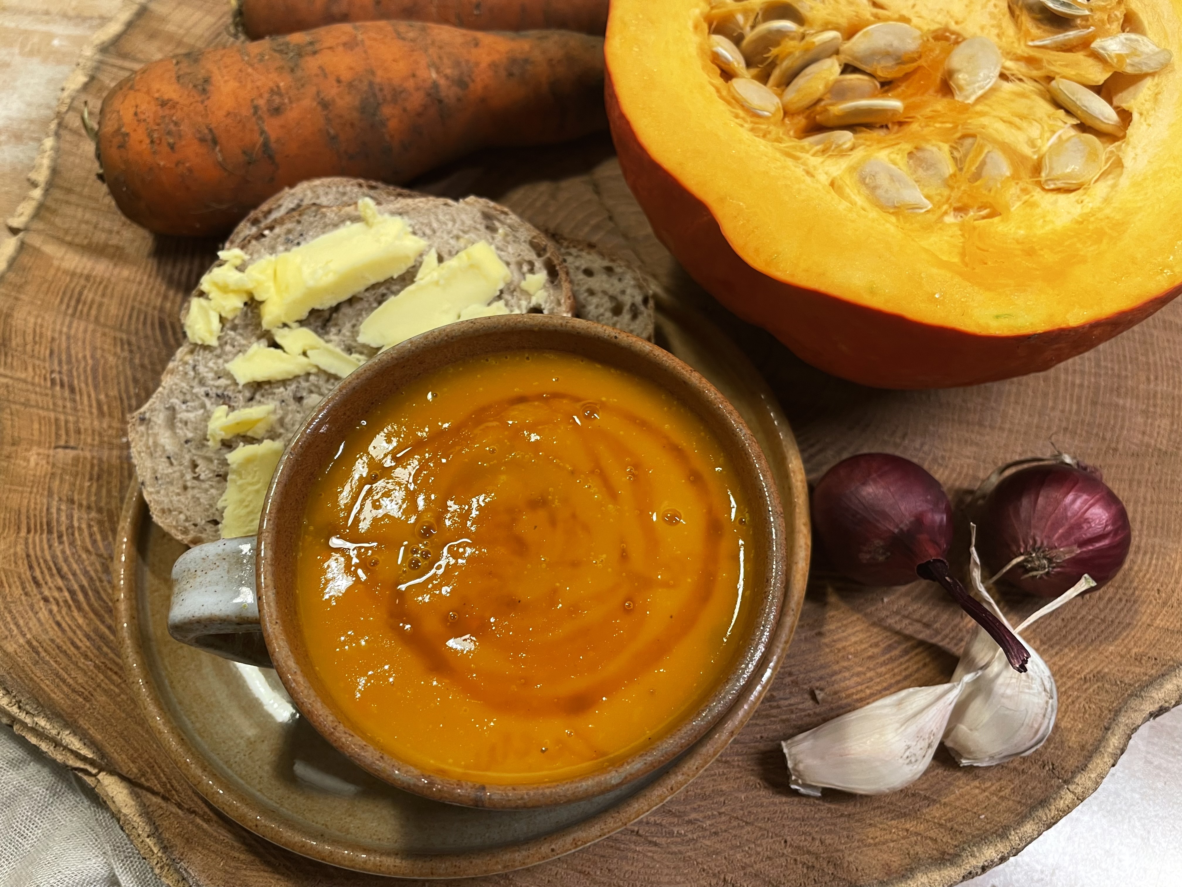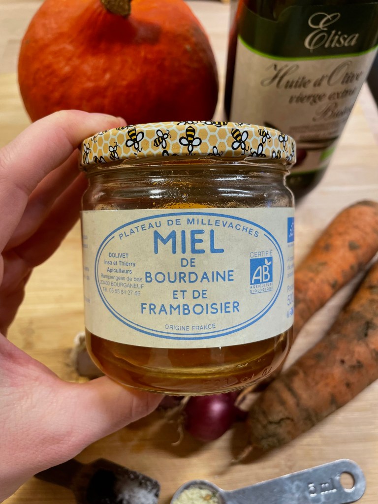 Le potimarron, légume d’automne s’il en est, est aujourd’hui accompagné de carottes, d’oignon rouge, d’ail et d’une cuillère de miel de bourdaine au moment de servir la soupe (une astuce découverte dans un grand restaurant gastronomique du Mans !).