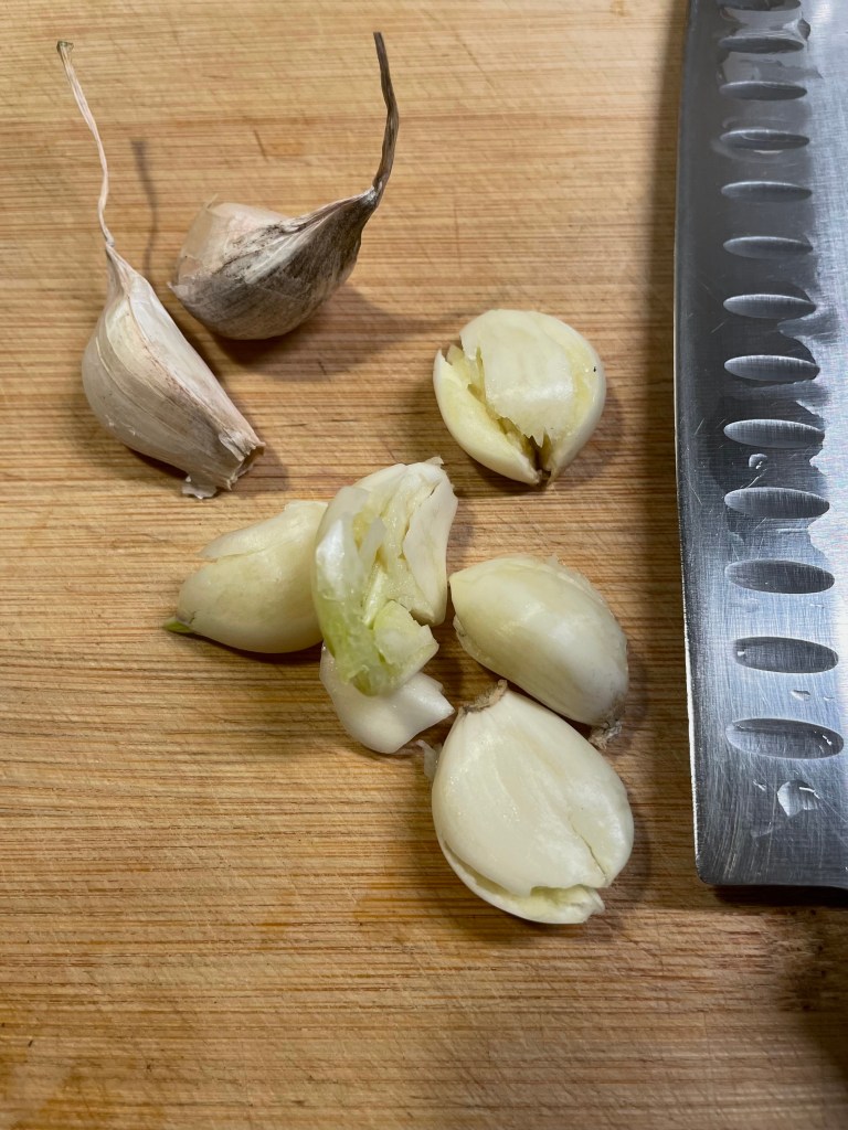 - Écraser les gousses d’ail avec le plat d’un couteau et les éplucher.