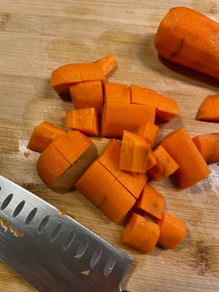 - Laver la carotte, l’éplucher et la couper grossièrement en cubes.