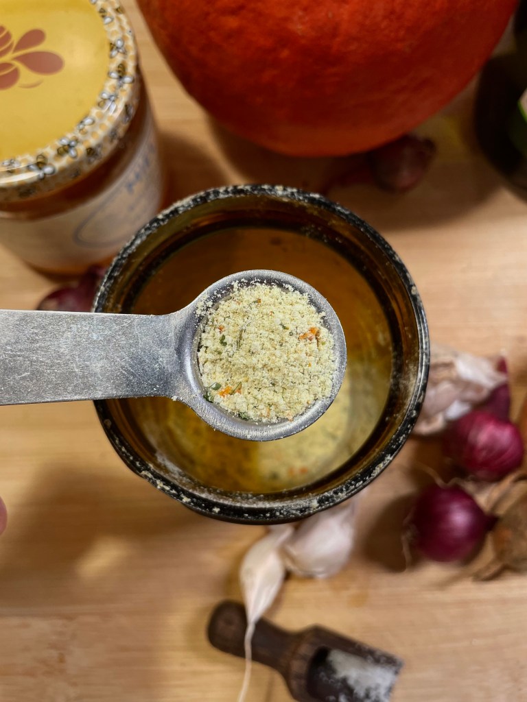 Le bouillon de légumes en poudre est un indispensable de nos placards, qu’il serve à parfumer une soupe, un roux dans des croque-monsieurs ou des lasagnes, des Frites de polenta au parmesan et duo de sauces, un Risotto de butternut au curry et au gongonzola ou encore des Quenelles de semoule de maïs gratinées aux champignons et à la mozzarella.