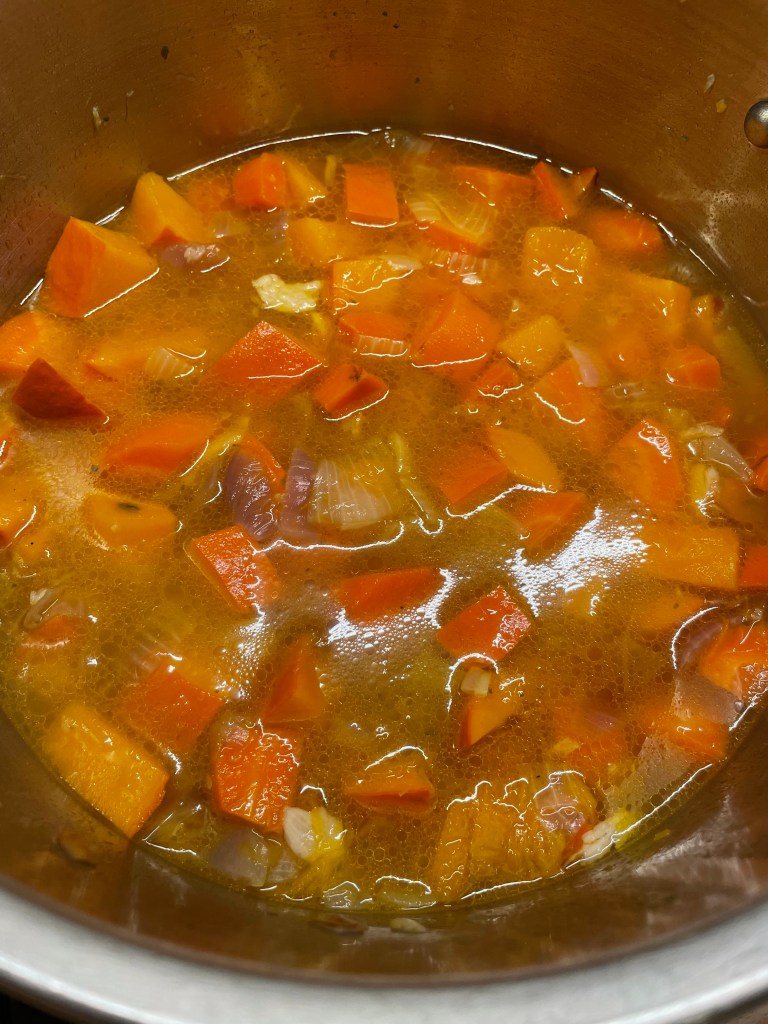 Comme toute bonne soupe d’automne qui se respecte, la base de cette recette repose sur trois légumes : la carotte, l’oignon et l’ail ; ces derniers doivent d’ailleurs bien rissoler dans l’huile d’olive pour en extraire un maximum de saveurs. Vous pouvez presser l’ail ou gagner du temps en l’écrasant avec le plat de votre couteau.