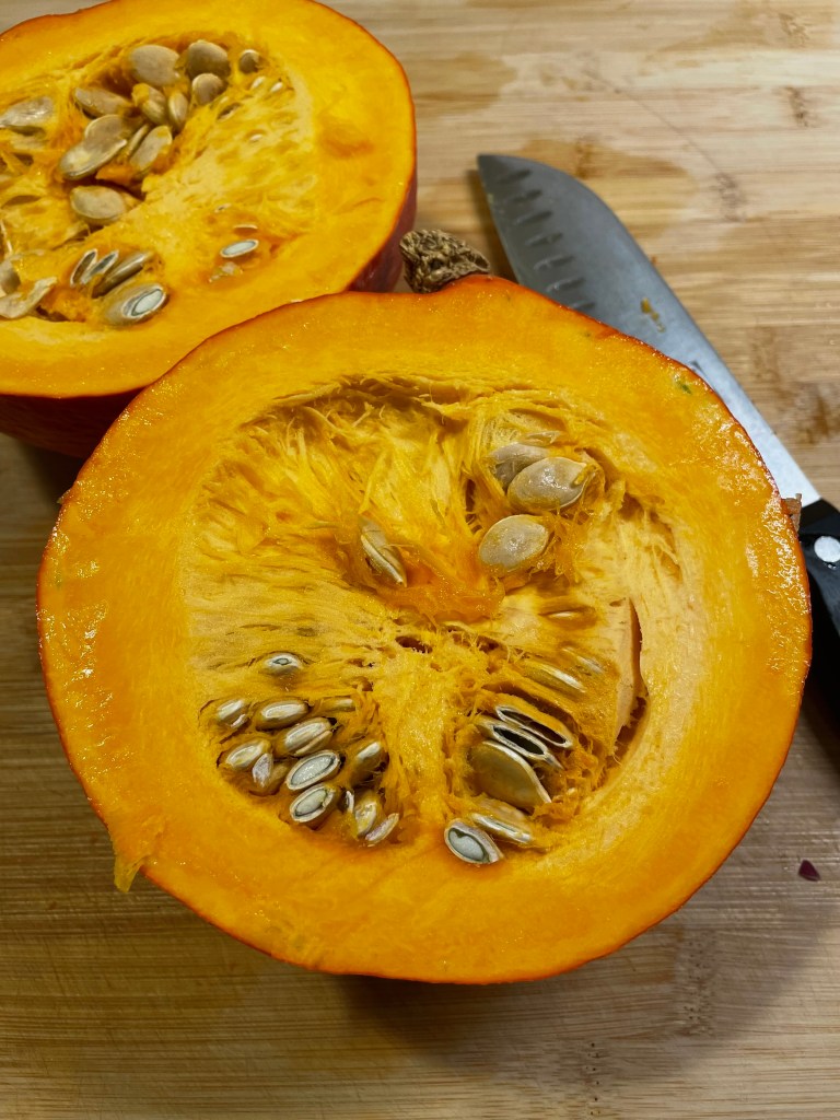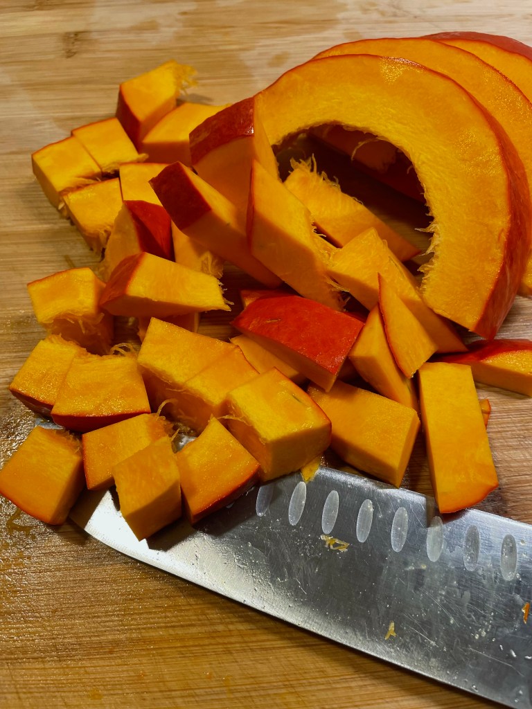 - Laver le potimarron, le couper et deux et en réserver la moitié pour une autre recette. Épépiner le demi-potimarron et le couper en cubes.