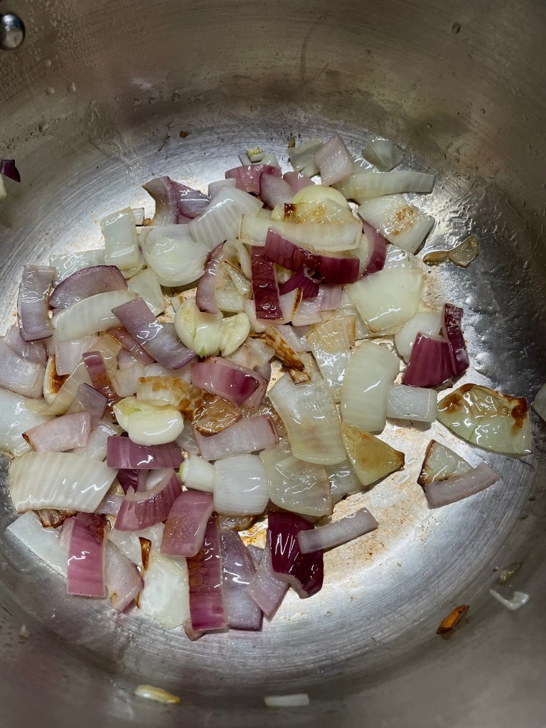 - Dans un faitout, faire suer l’ail et l’oignon dans l’huile d’olive.