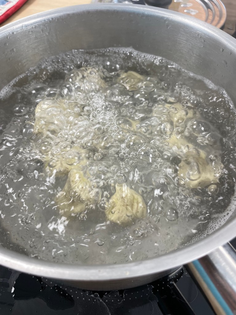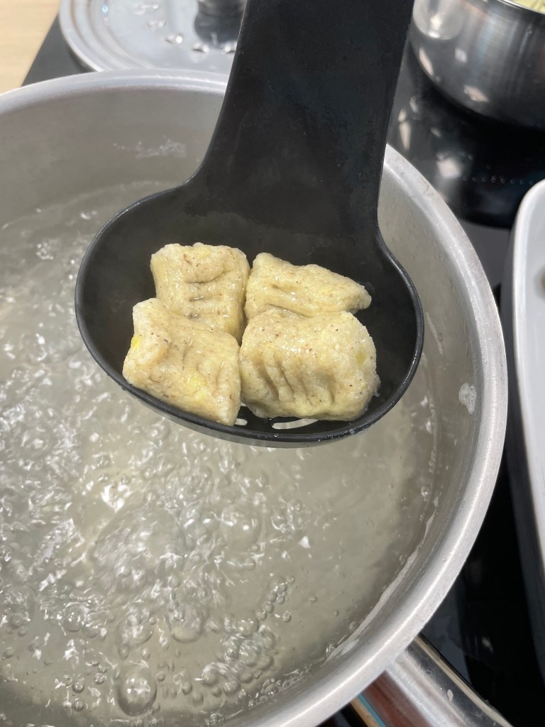 Après avoir passé quelques minutes dans l’eau bouillante, nos gnocchis sont prêts à être dégustés… mais nous avons préféré les faire revenir dans le beurre demi-sel du GAEC de la Pie afin de les parfumer encore plus.