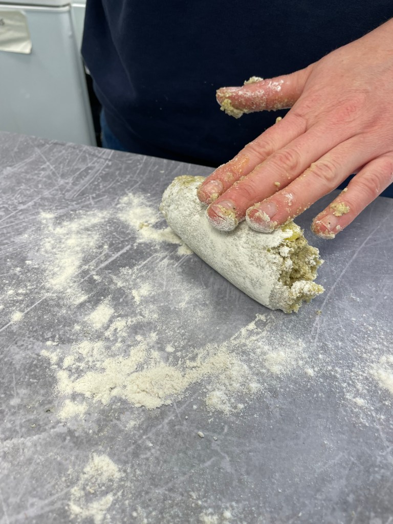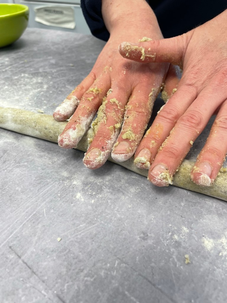 - Former quatre pâtons et les rouler sur un plan de travail fariné pour les transformer en boudins.