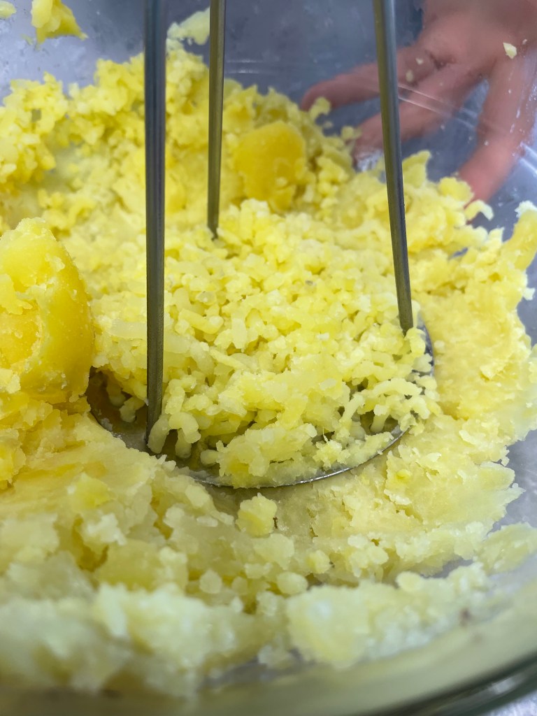 - Peler les pommes de terre et les réduire en purée dans un cul-de-poule.