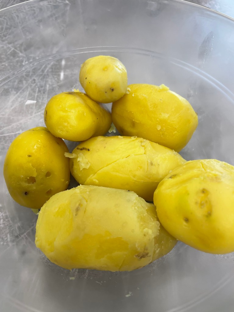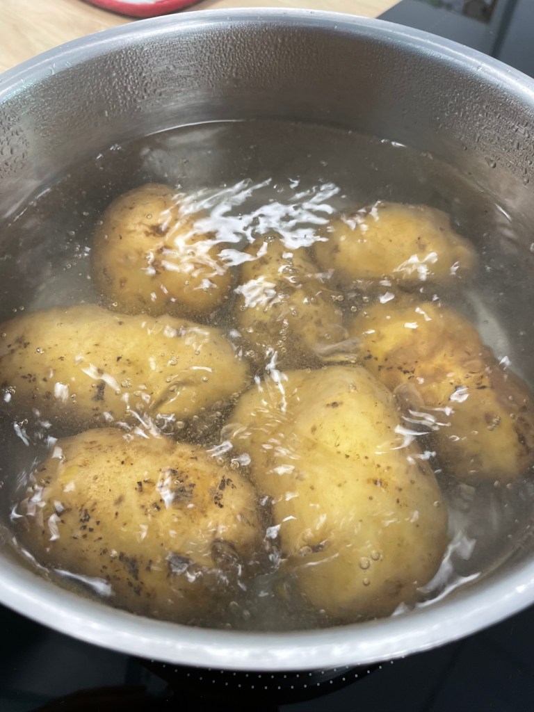 - Vérifier la cuisson des pommes de terre à l’aide d’un couteau ; lorsqu’elles sont cuites, les égoutter et les laisser tiédir.