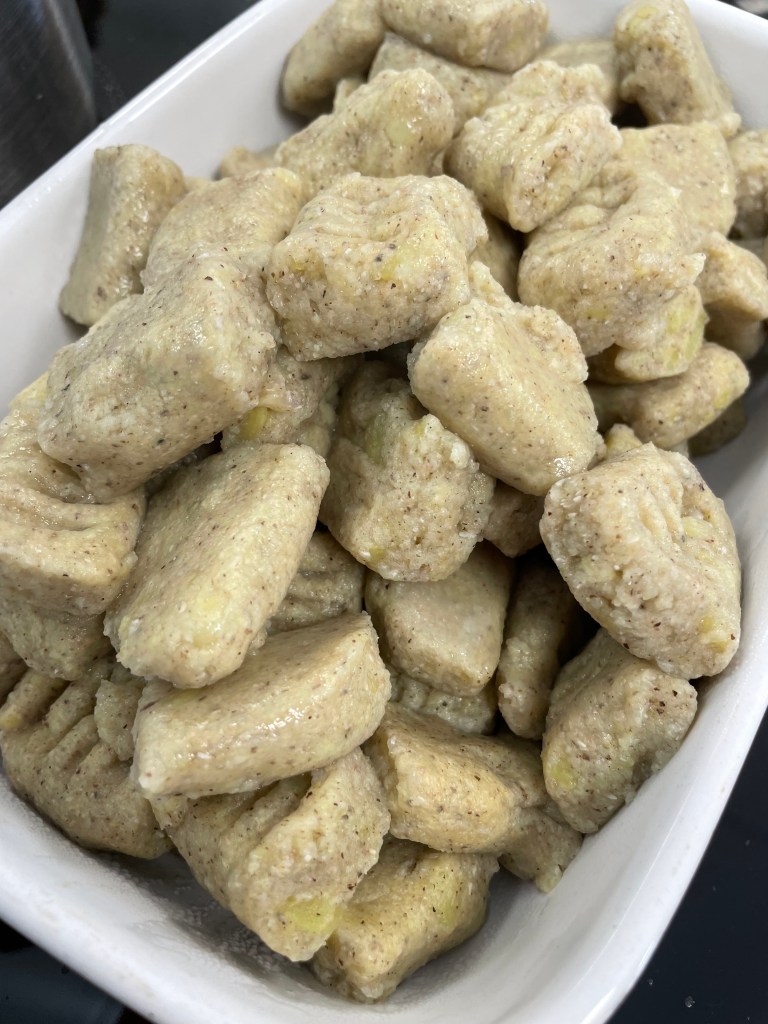 Les gnocchis sont des petites pâtes italiennes préparées à partir d’un mélange de farine et de pommes de terre, pochées à l’eau, puis gratinées au four ou dorées à la poêle.