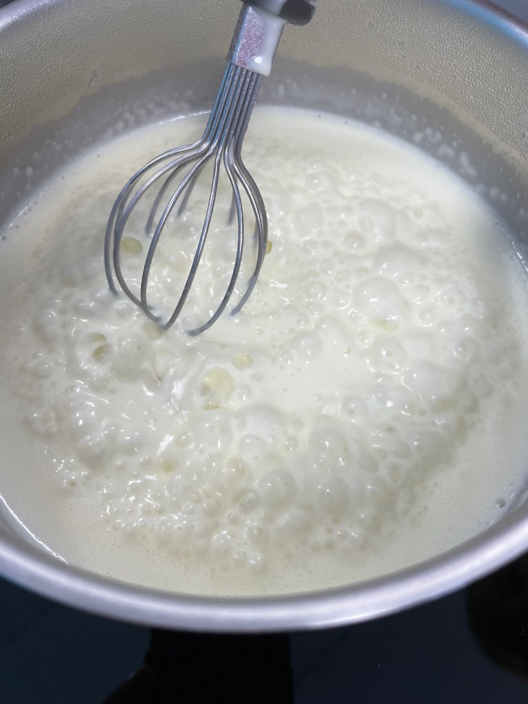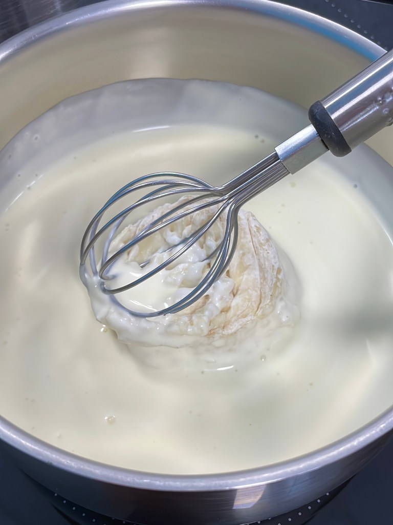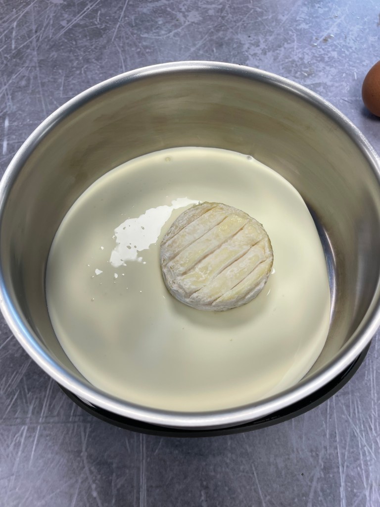 Il possède une croûte fine et une couleur jaune très pâle ; à la coupe, sa pâte est lisse et coulante lorsqu’il est bien avancé. Ici, nous l’avons fait fondre dans la crème liquide pour obtenir une sauce crémeuse et parfumée.