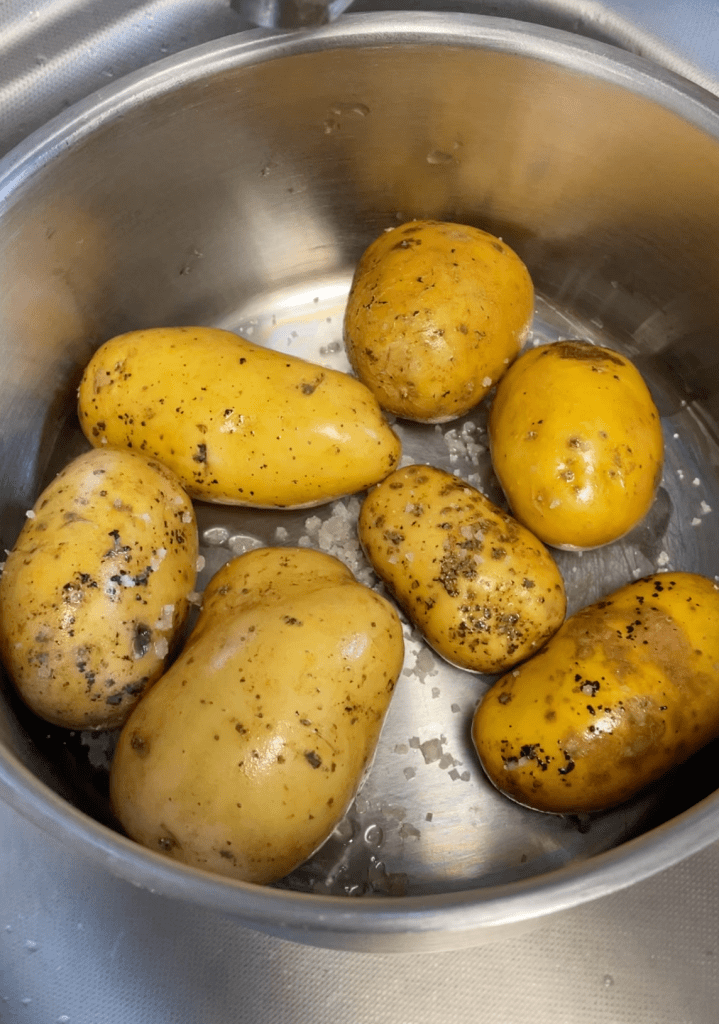 - Laver les pommes de terre et les cuire avec la peau dans de l’eau salée bouillante pendant 30 à 35 minutes.