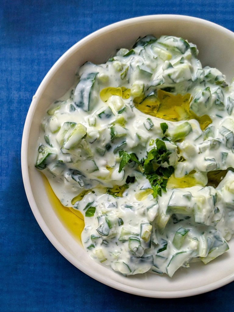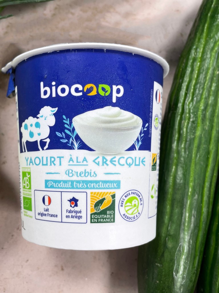 - Mélanger le yaourt et les épices, puis incorporer le concombre et napper d’un filet d’huile d’olive.