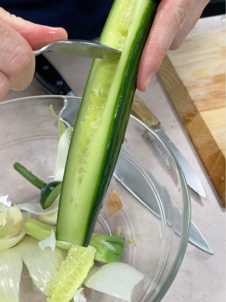 - Laver le concombre, le couper en deux, l’épépiner à l’aide d’une petite cuillère et le détailler en tranches.