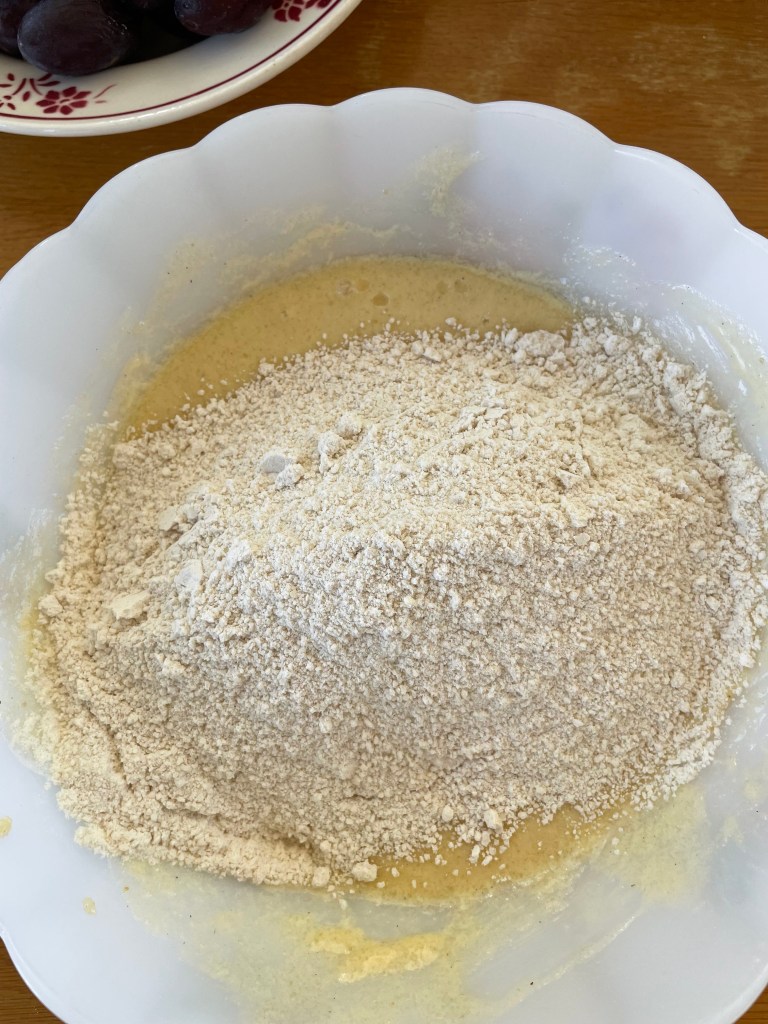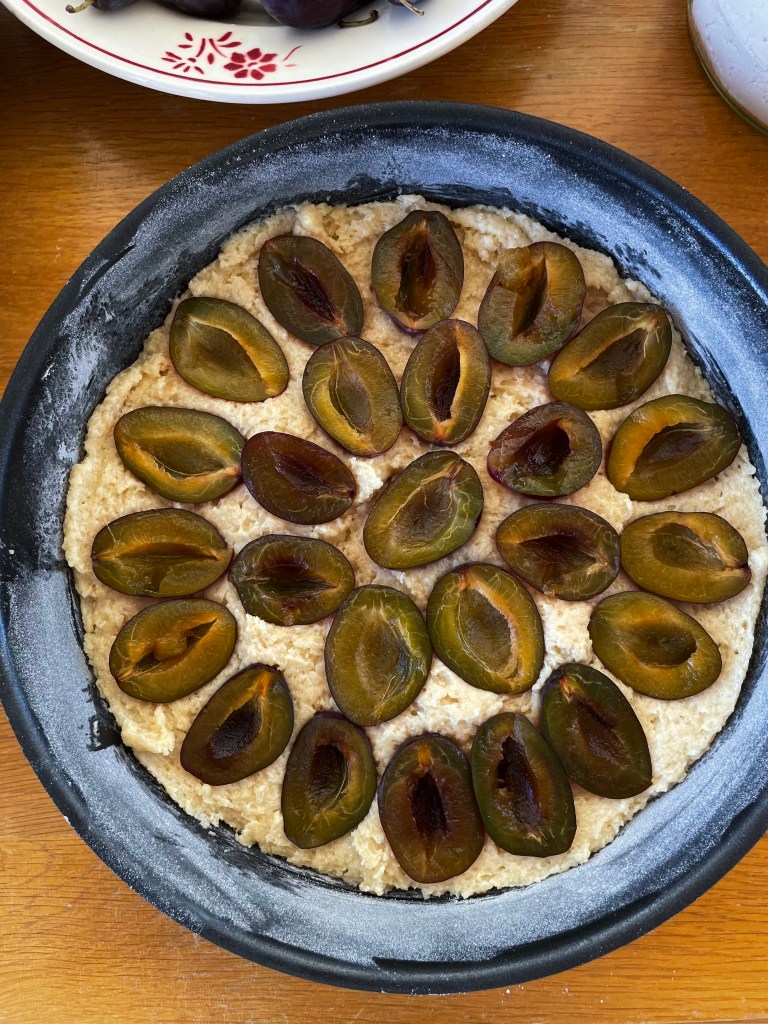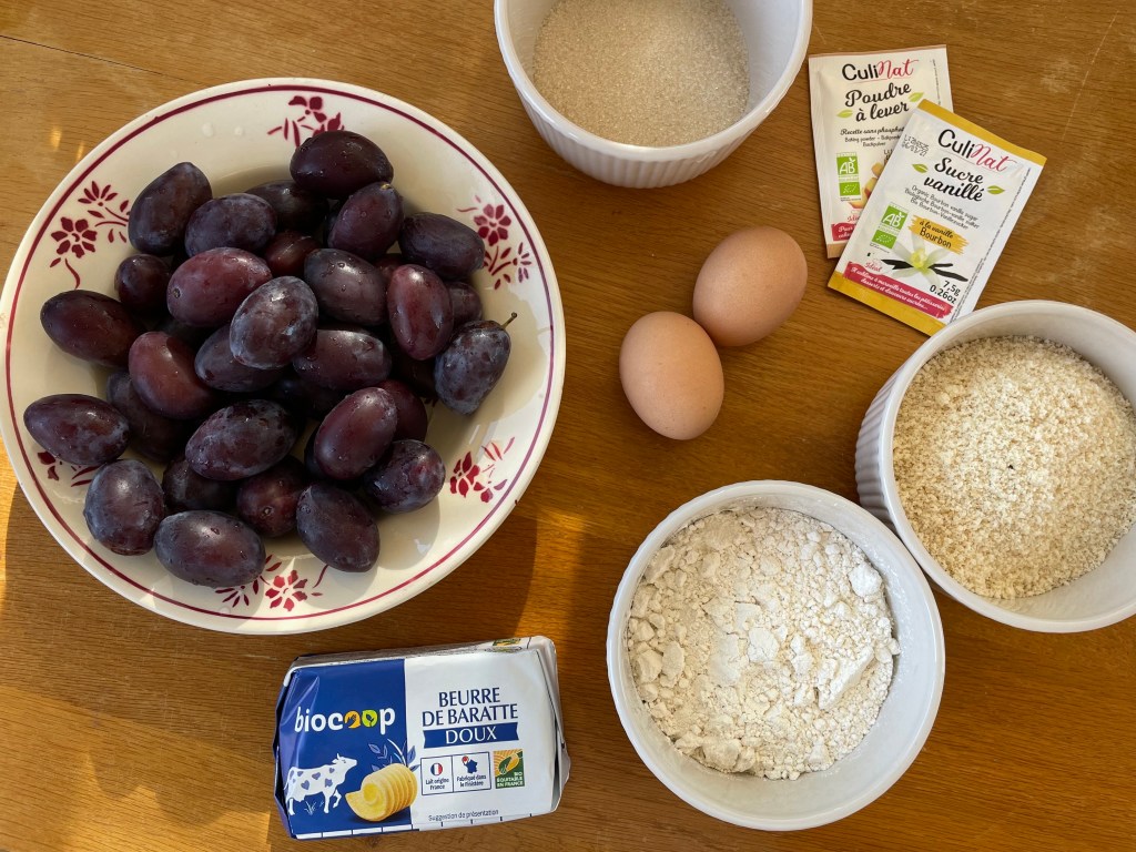 Cependant, pour lui apporter un peu d’originalité et faire honneur à nos fruits bio de saison, nous l’avons marié avec des prunes ; ici des Quetsches, mais toutes les variétés fonctionnent ! Il suffit de les laver, de les couper en deux et de les dénoyauter avant de les déposer sur la pâte à gâteau.