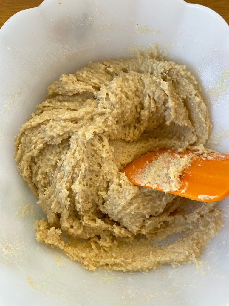 - Ajouter la farine, la poudre d’amande, la poudre à lever, le sel et mélanger jusqu’à obtenir une pâte homogène.