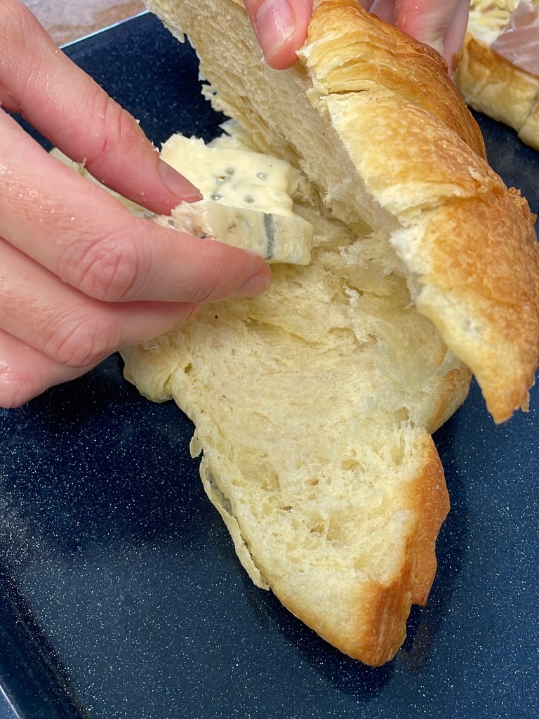 - Ouvrir les croissants sans les couper entièrement en deux pour les garnir de gorgonzola, de champignons et de poires.