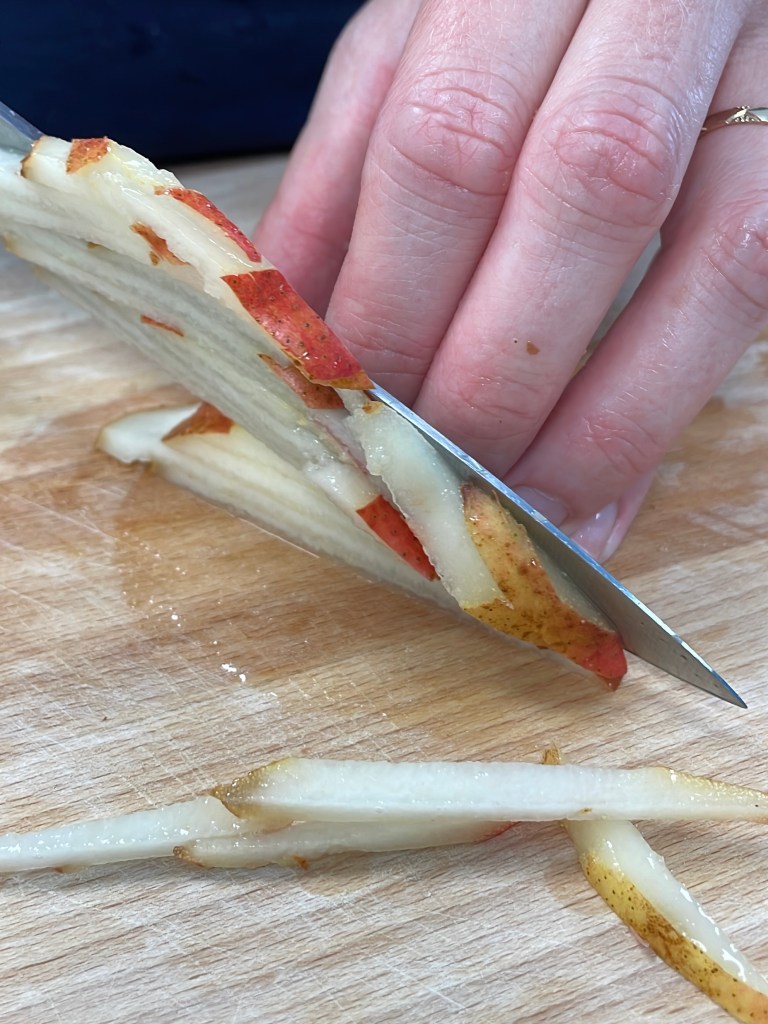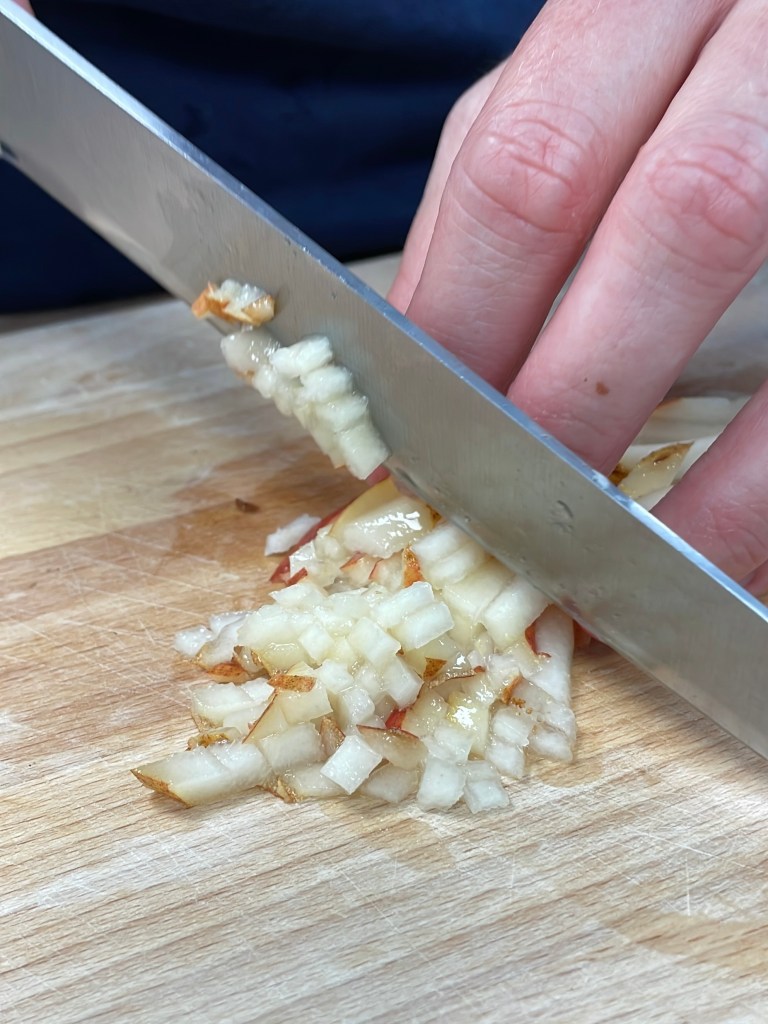 - Laver les poires, les tailler en tranches fines, puis en julienne et enfin en brunoise. Les ajouter aux champignons en fin de cuisson.