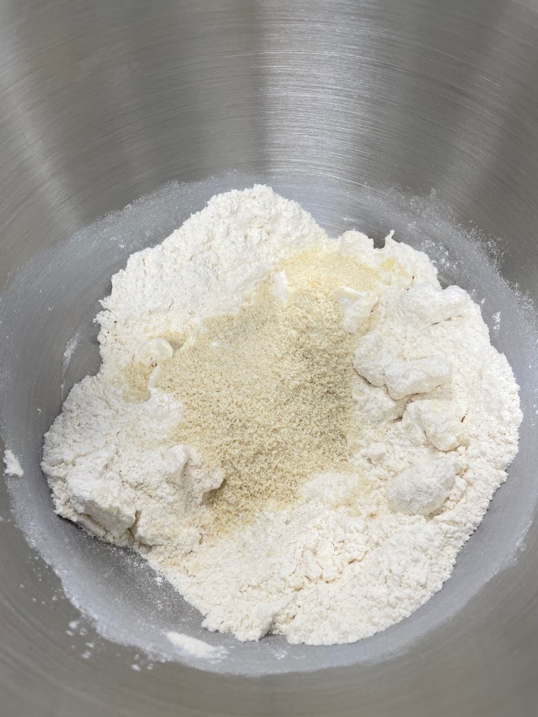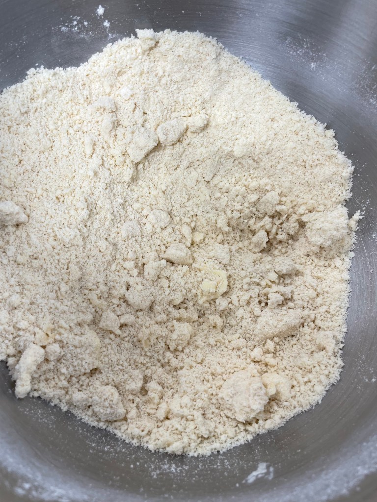 - Préparer la pâte : sabler la farine, la poudre d’amande, le sucre glace et le beurre mou.