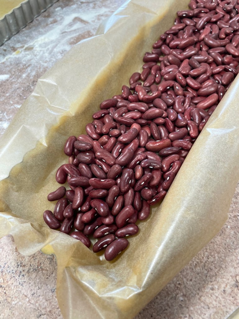 La pâte sucrée est ici cuite à blanc : vous pouvez utiliser des billes d’argile si vous en possédez, mais des haricots secs fonctionneront parfaitement ; mettez-les ensuite de côté pour les réutiliser en pâtisserie, ils ne pourront plus être consommés comme des haricots.