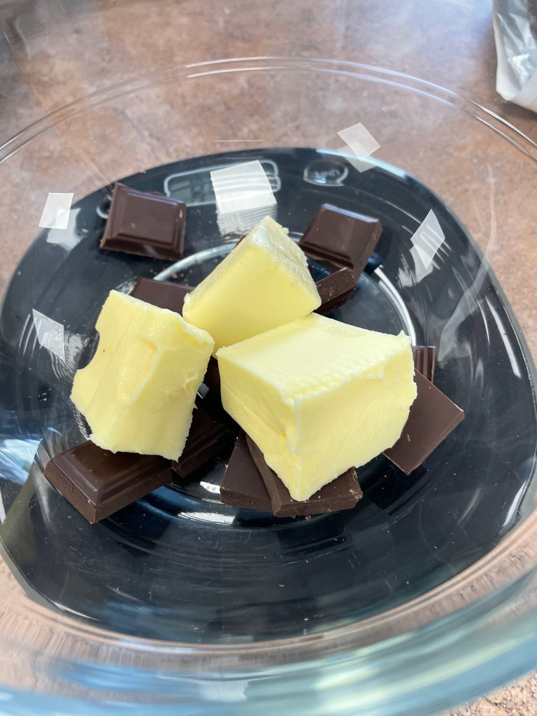 Nous avons fait fondre très doucement notre chocolat noir 58% de cacao et notre beurre demi-sel au bain-marie afin d’obtenir la texture idéale pour ensuite l’incorporer à la poudre d’amandes.