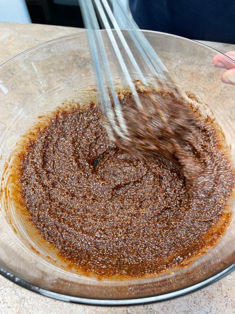 - Dans un cul-de-poule, mélanger le chocolat, la poudre d’amande, le sirop de yacon et les œufs.