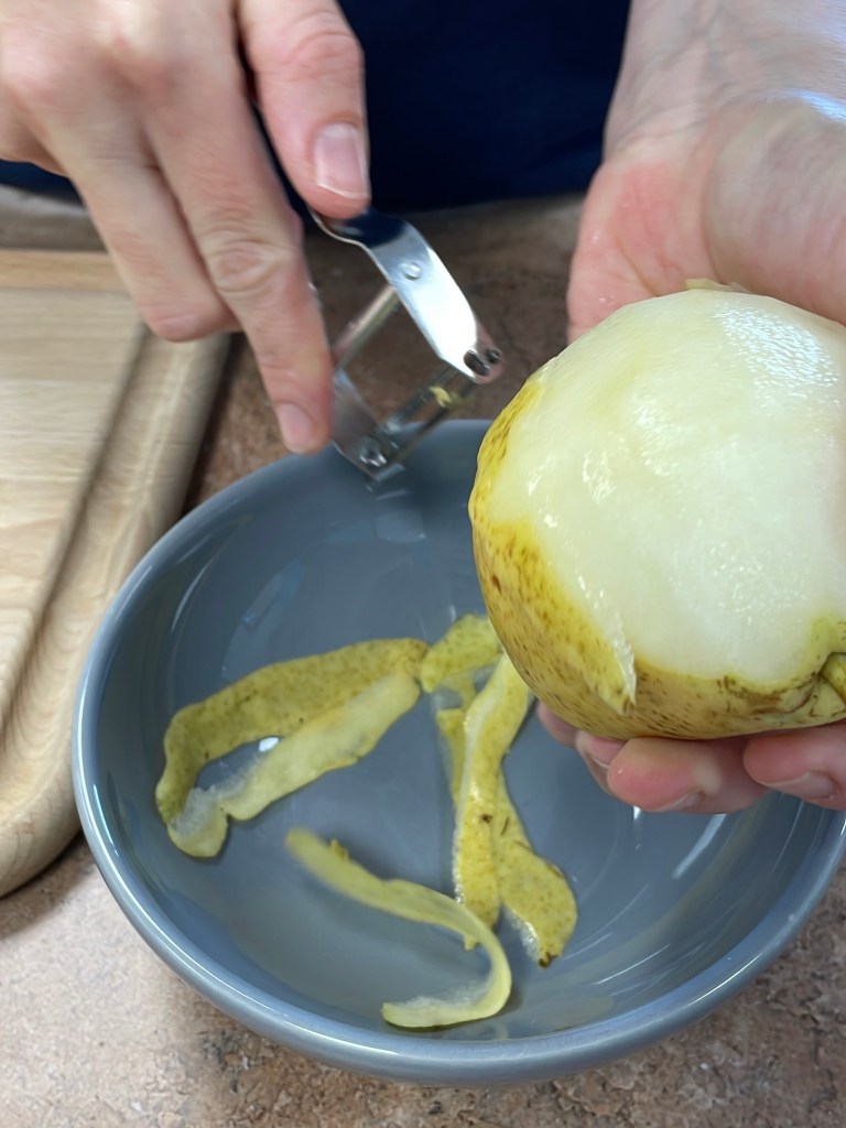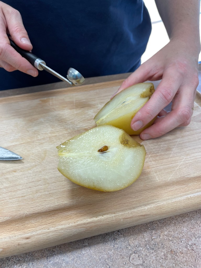 - Couper les poires en deux, les évider et les trancher en fines lamelles.