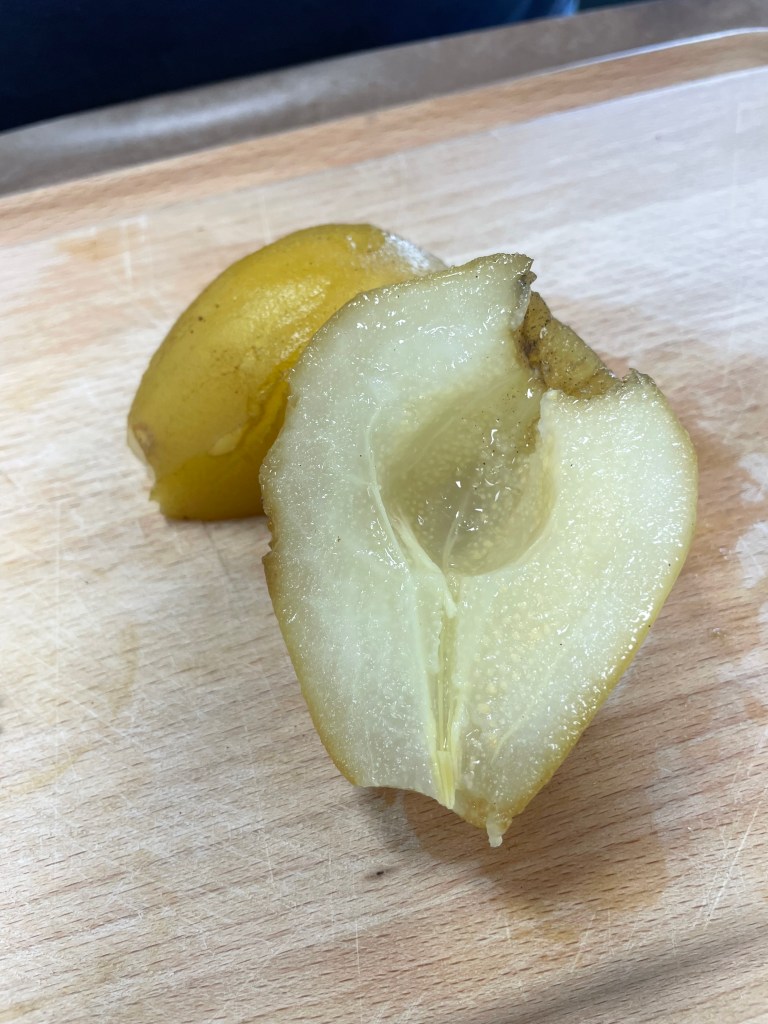 - Plonger les poires entières dans le sirop et les cuire 15 à 20 minutes à feu moyen : tester la cuisson avec la pointe d’un couteau. Lorsqu’elles sont cuites, les retirer du sirop et les laisser refroidir.