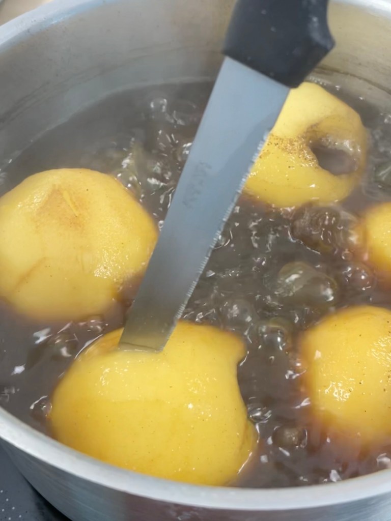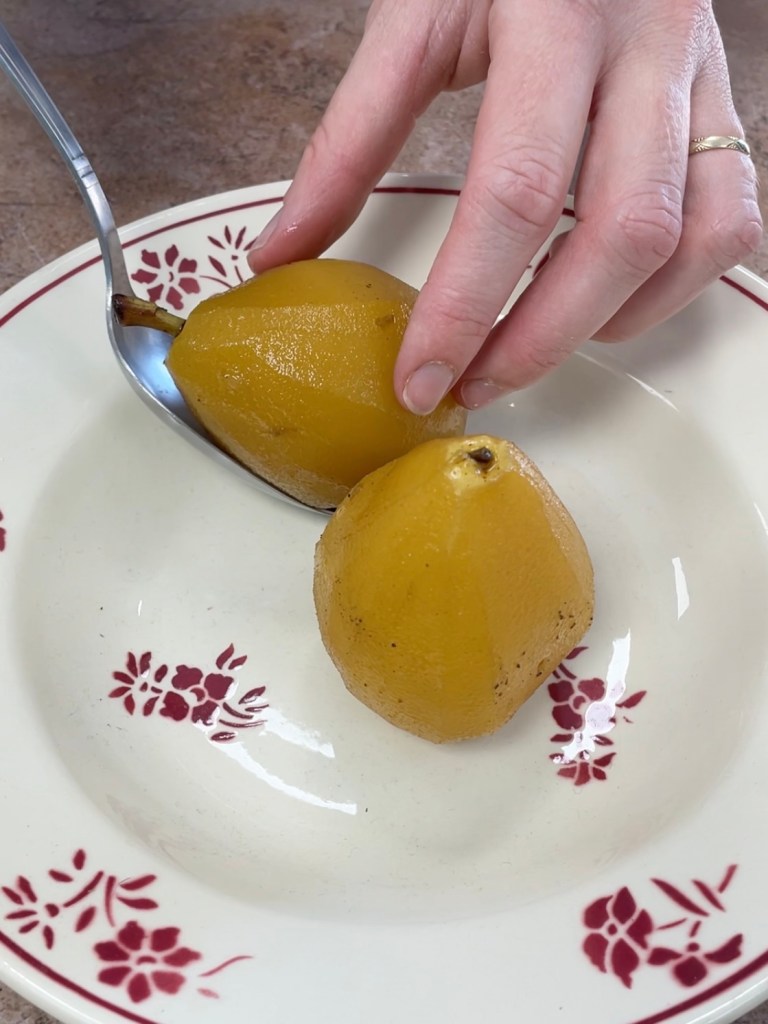 - Plonger les poires entières dans le sirop et les cuire 15 à 20 minutes à feu moyen : tester la cuisson avec la pointe d’un couteau. Lorsqu’elles sont cuites, les retirer du sirop et les laisser refroidir.