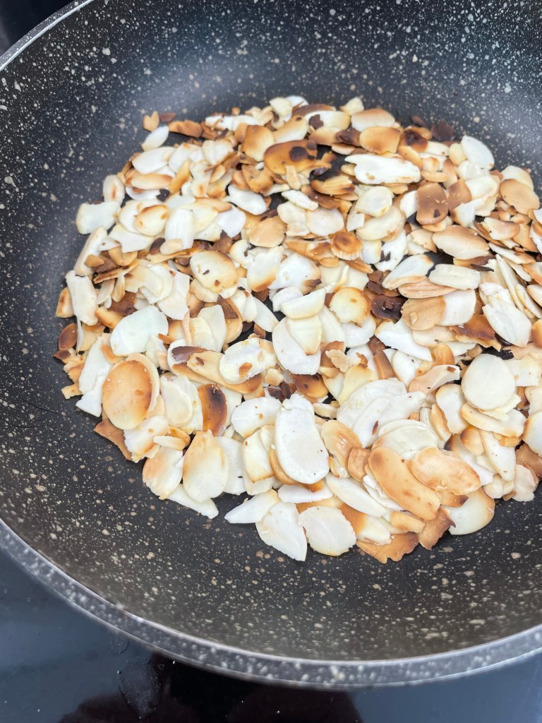 - Dans une poêle, torréfier les amandes effilées à sec.