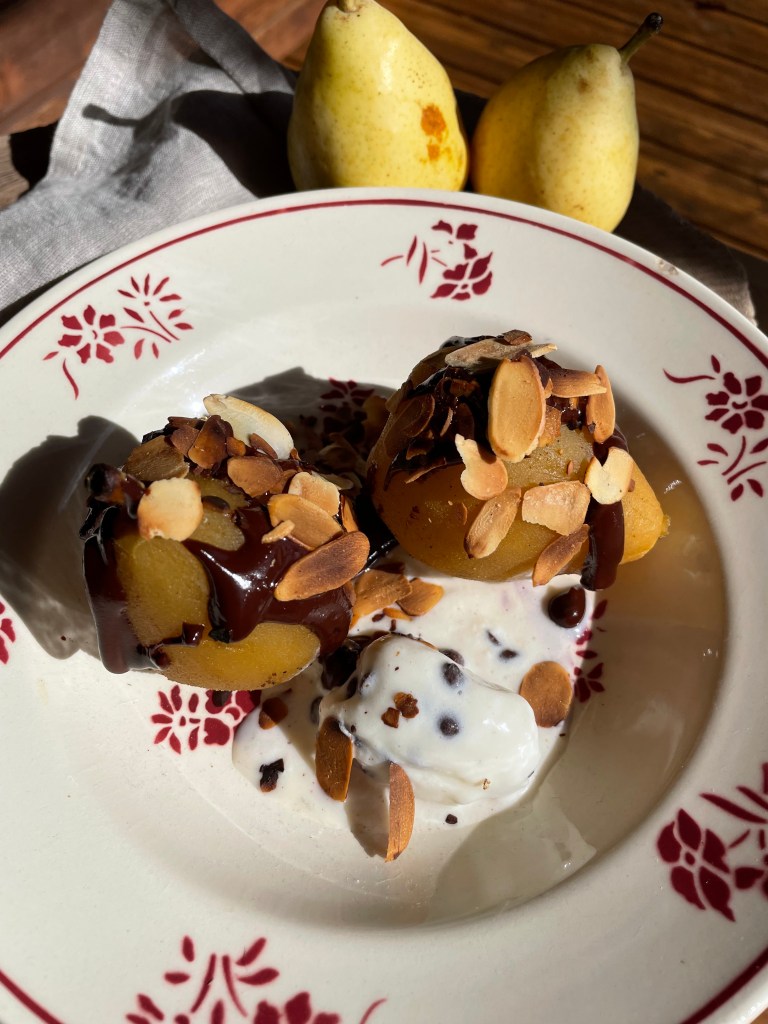 Une fois les poires pochées disposées dans vos assiettes creuses, il ne vous reste plus qu’à assembler votre dessert : un filet de chocolat fondu, une boule de crème glacée, des amandes effilées… À déguster !