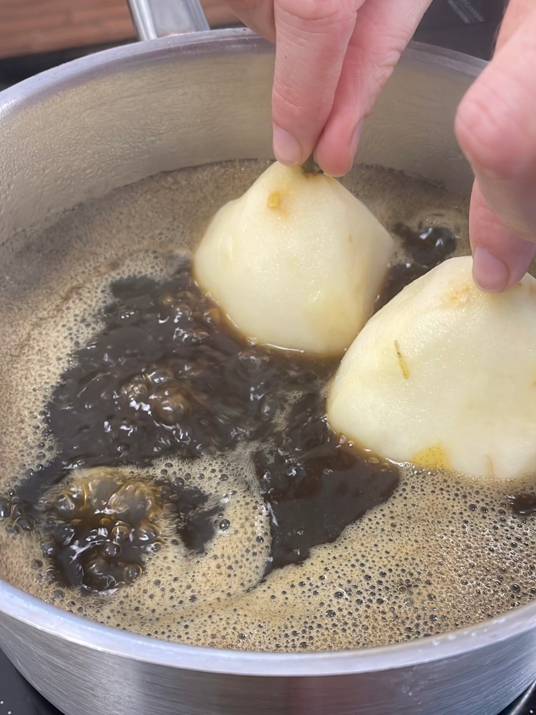 - Pocher les poires : dans une casserole, porter à ébullition l’eau, le sirop de yacon et la vanille.