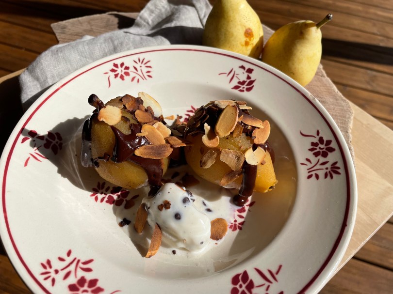 Une fois les poires pochées disposées dans vos assiettes creuses, il ne vous reste plus qu’à assembler votre dessert : un filet de chocolat fondu, une boule de crème glacée, des amandes effilées… À déguster !