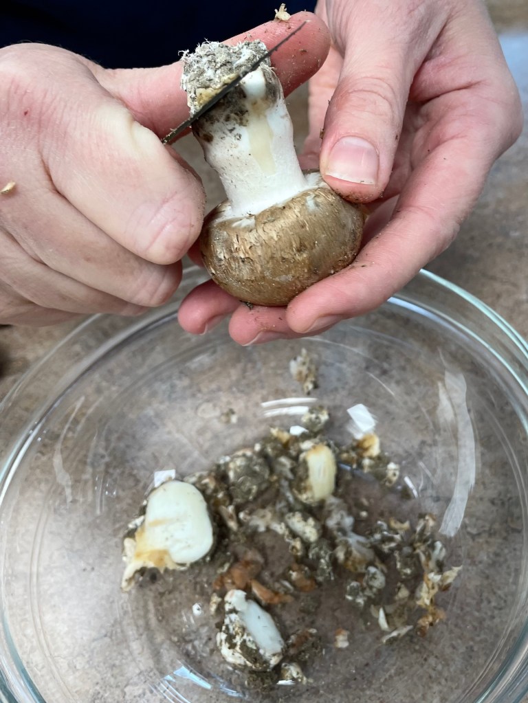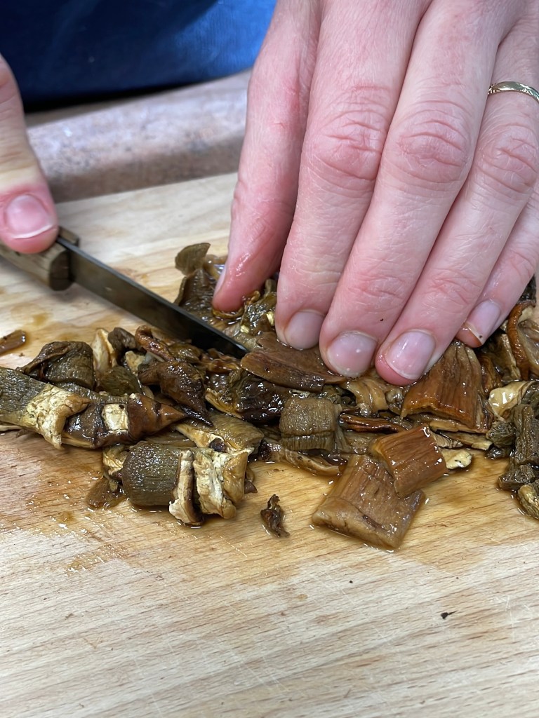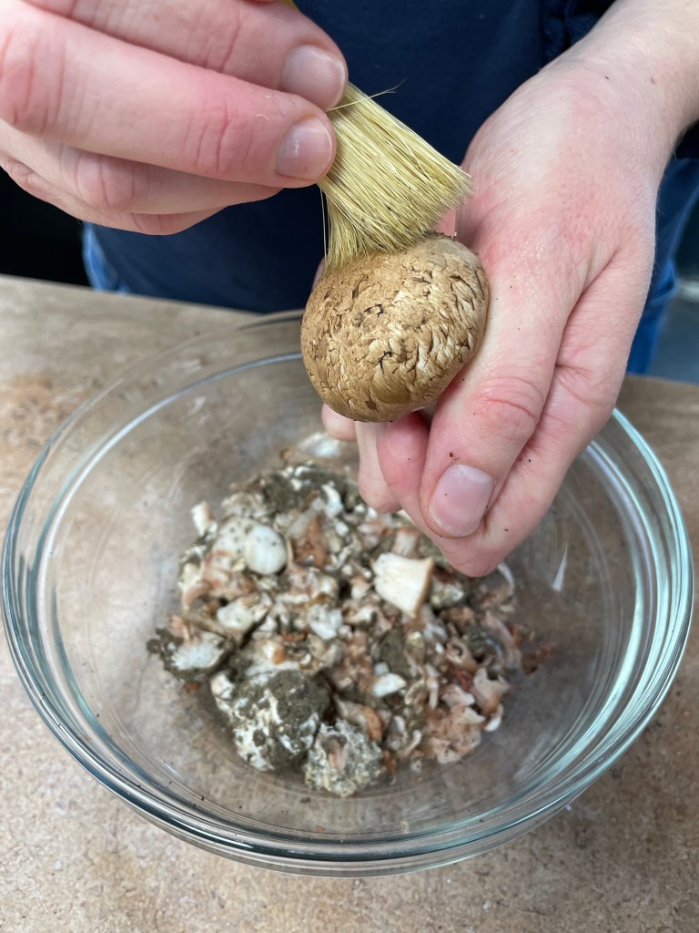 6. Équeuter les champignons blonds, les brosser à l’aide d’un pinceau et les couper en lamelles.
