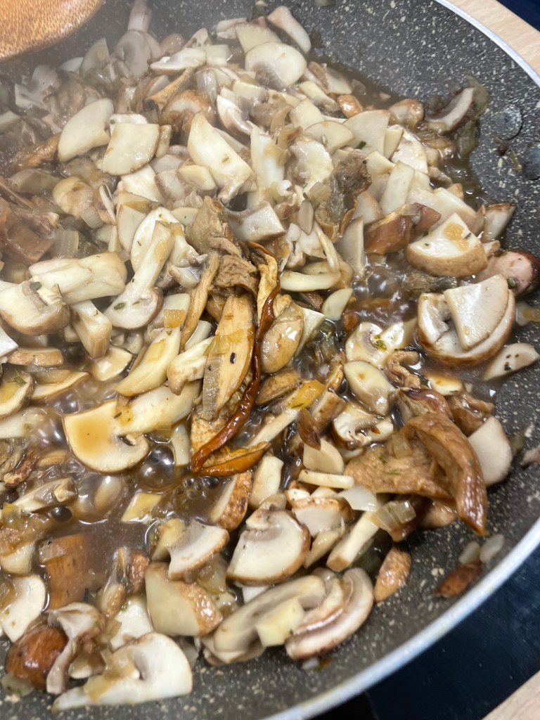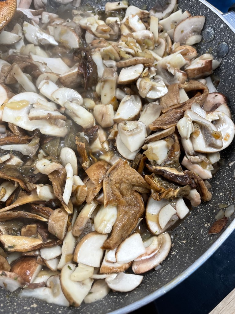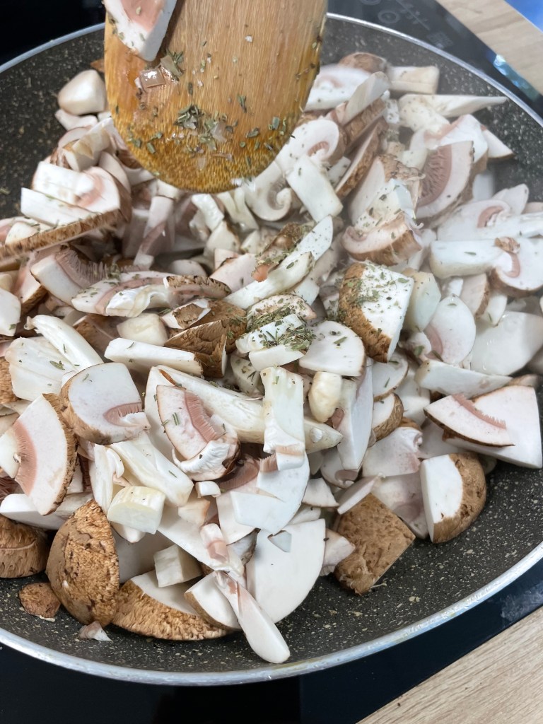 8. Ajouter tous les champignons dans la poêle, saler, poivrer et saupoudrer d’herbes de Provence, puis cuire à feu moyen environ 10 minutes pour que l’eau de végétation s’évapore.