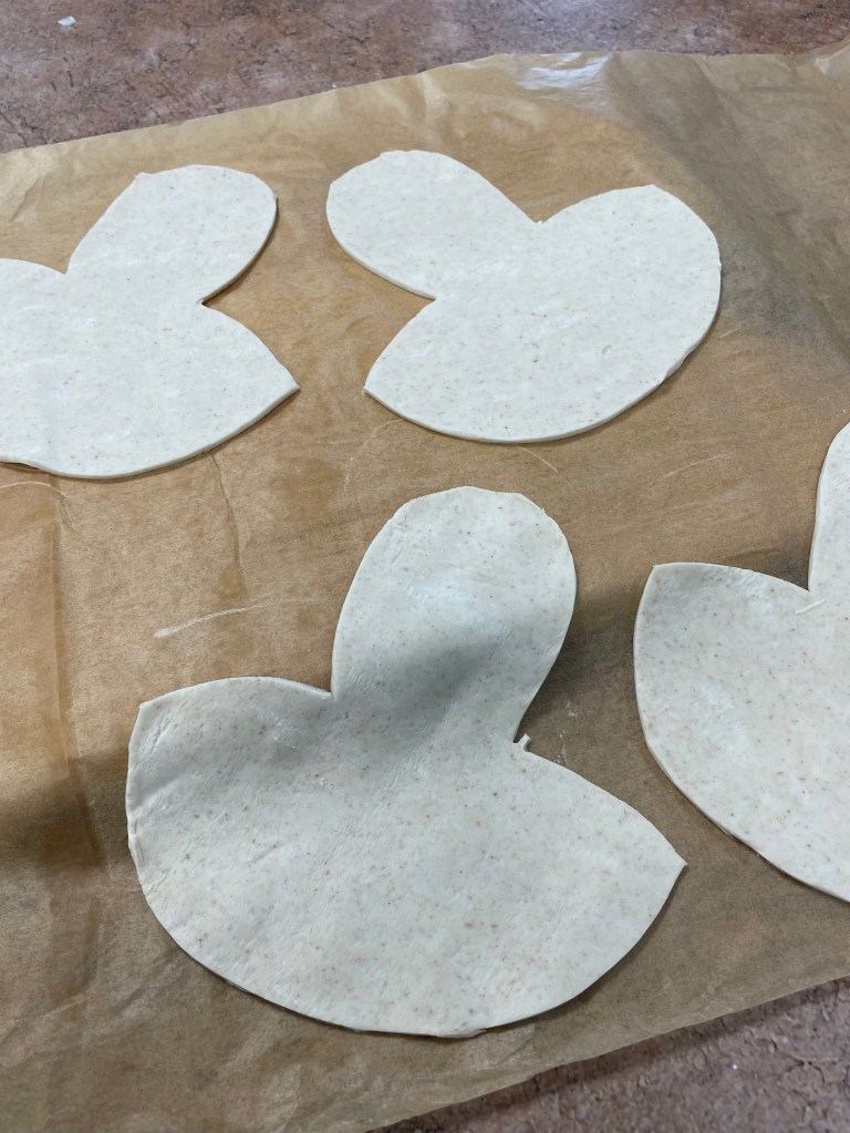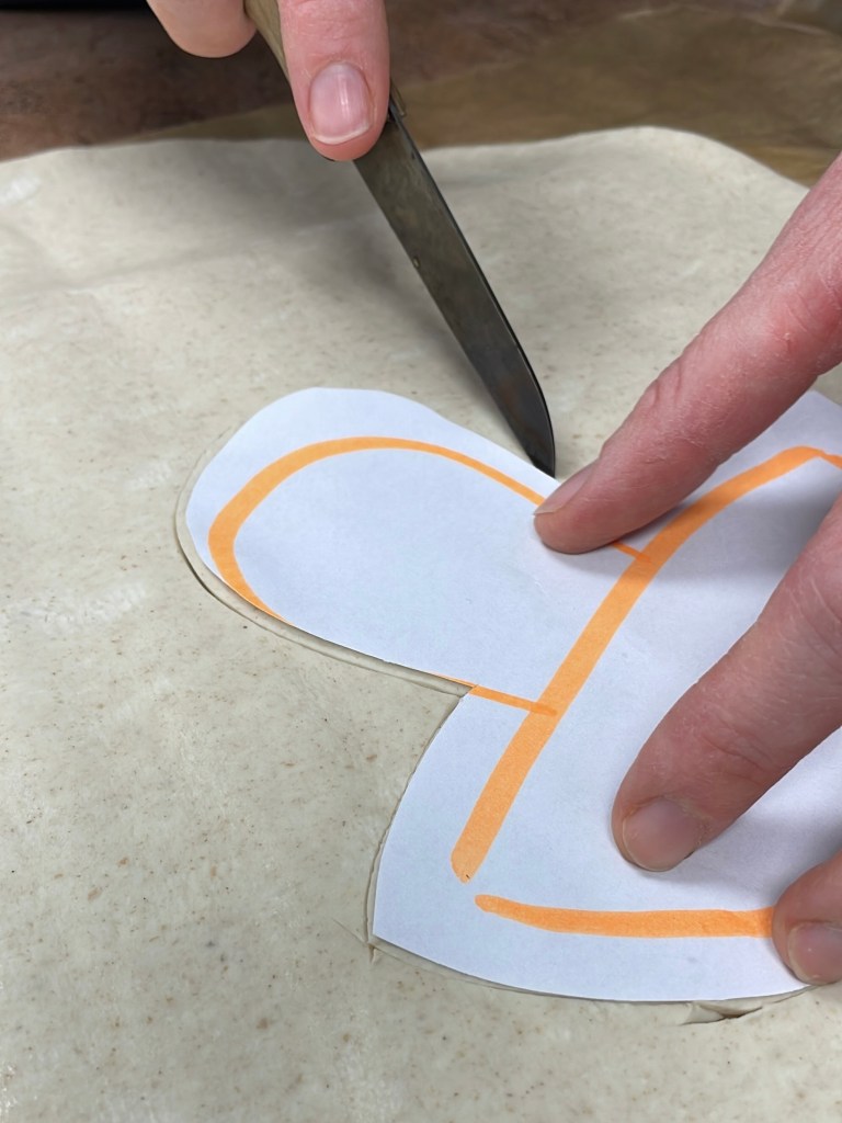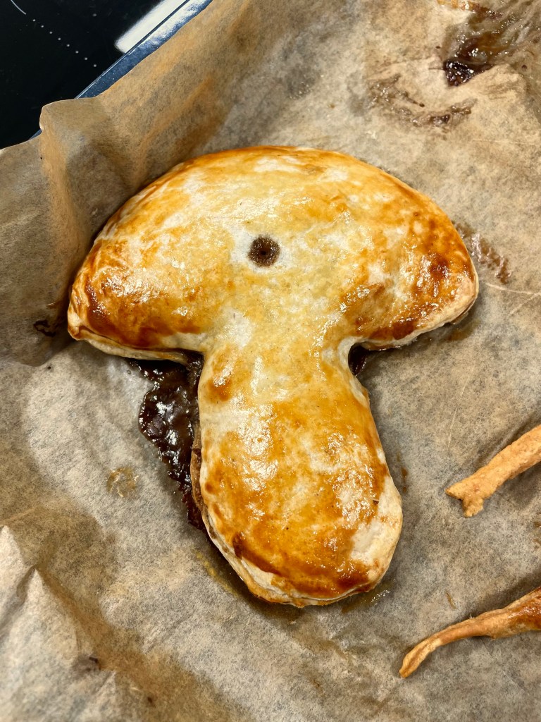 Ensuite, laissez libre cours à votre imagination : nous avons dessiné un patron de champignon qui nous a permis de découper aisément notre pâte feuilletée (4 formes par pâte, soit 2 tourtes).
